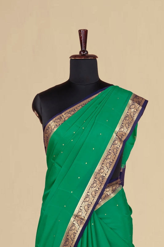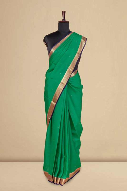 Sold outPure Mysore Silk Saree in Emerald Green with Gold Zari Border and Subtle Body Buttas