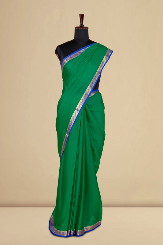 SalePure Mysore Silk Saree in Emerald Green with Royal Blue Contrast Zari Border & Rich Pallu