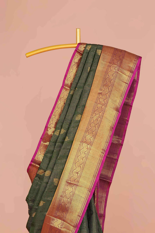 Sold outOlive Green & Pink Long Border Kanchipuram Pure Silk Saree with Gold Zari Detailing