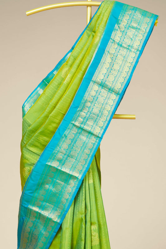 Sold outKanchipuram Vairaoosi and checks Silk Saree in Parrot Green with Gold Zari and Blue Contrast Border
