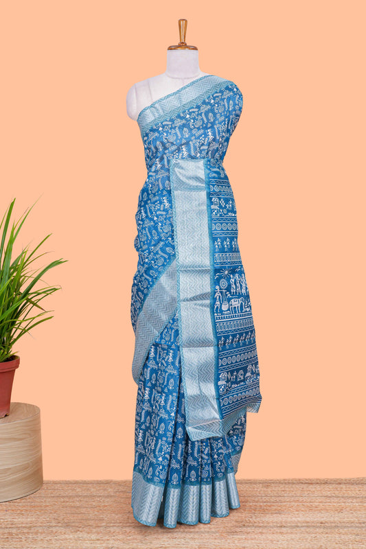 Borderless black south cotton saree with blue adire batik print on body and pallu
