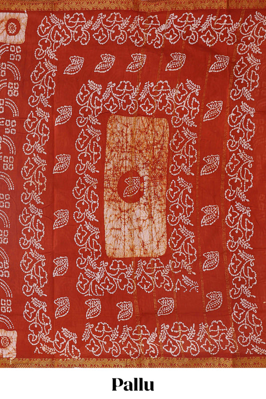 Brick red bandhini style sungudi cotton saree with contrast border and matching pallu