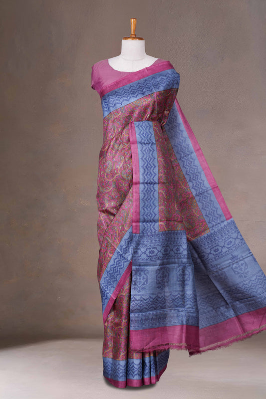 SaleMagenta & Blue Pure Tussar Silk Printed Saree with Paisley & Geometric Motifs, Contrast Border & Pallu