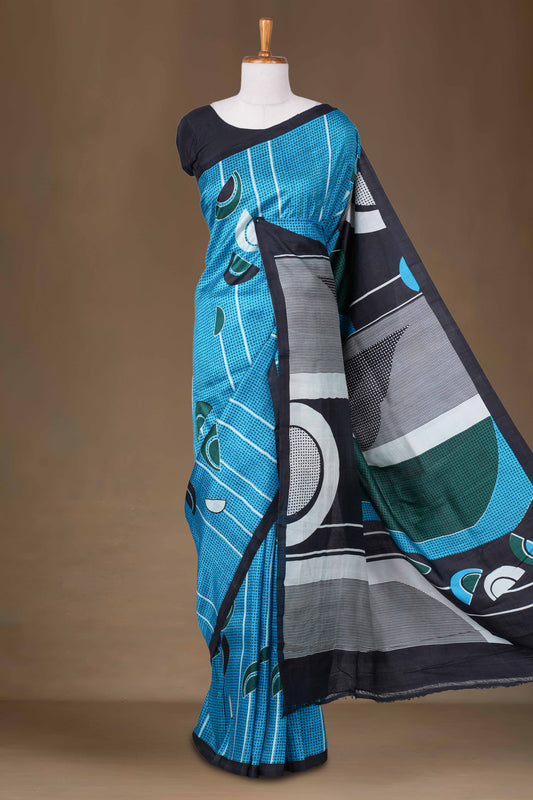 SaleTurquoise Blue & Black Pure Tussar Silk Saree with Digital Abstract Print and Grey Contrast Pallu
