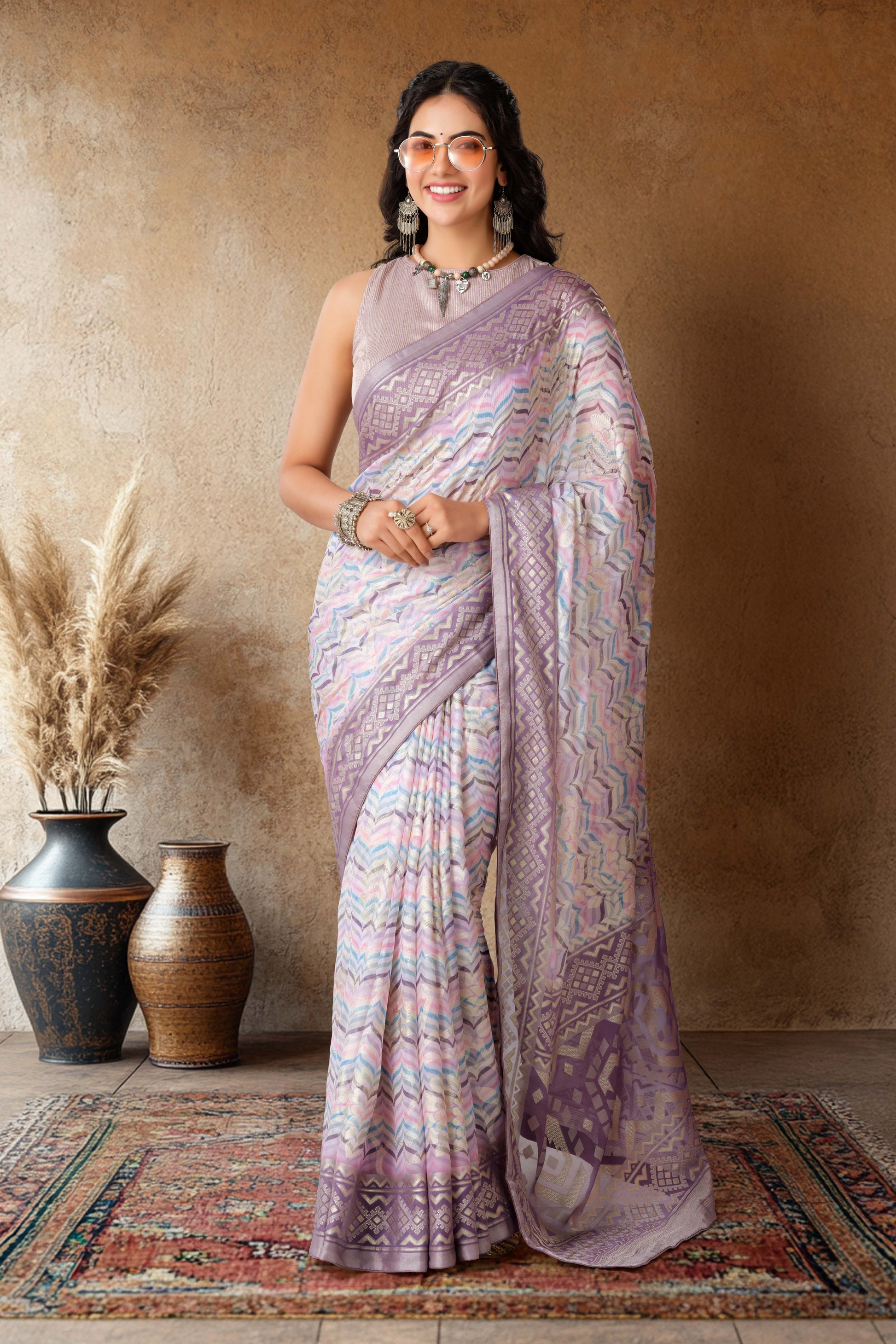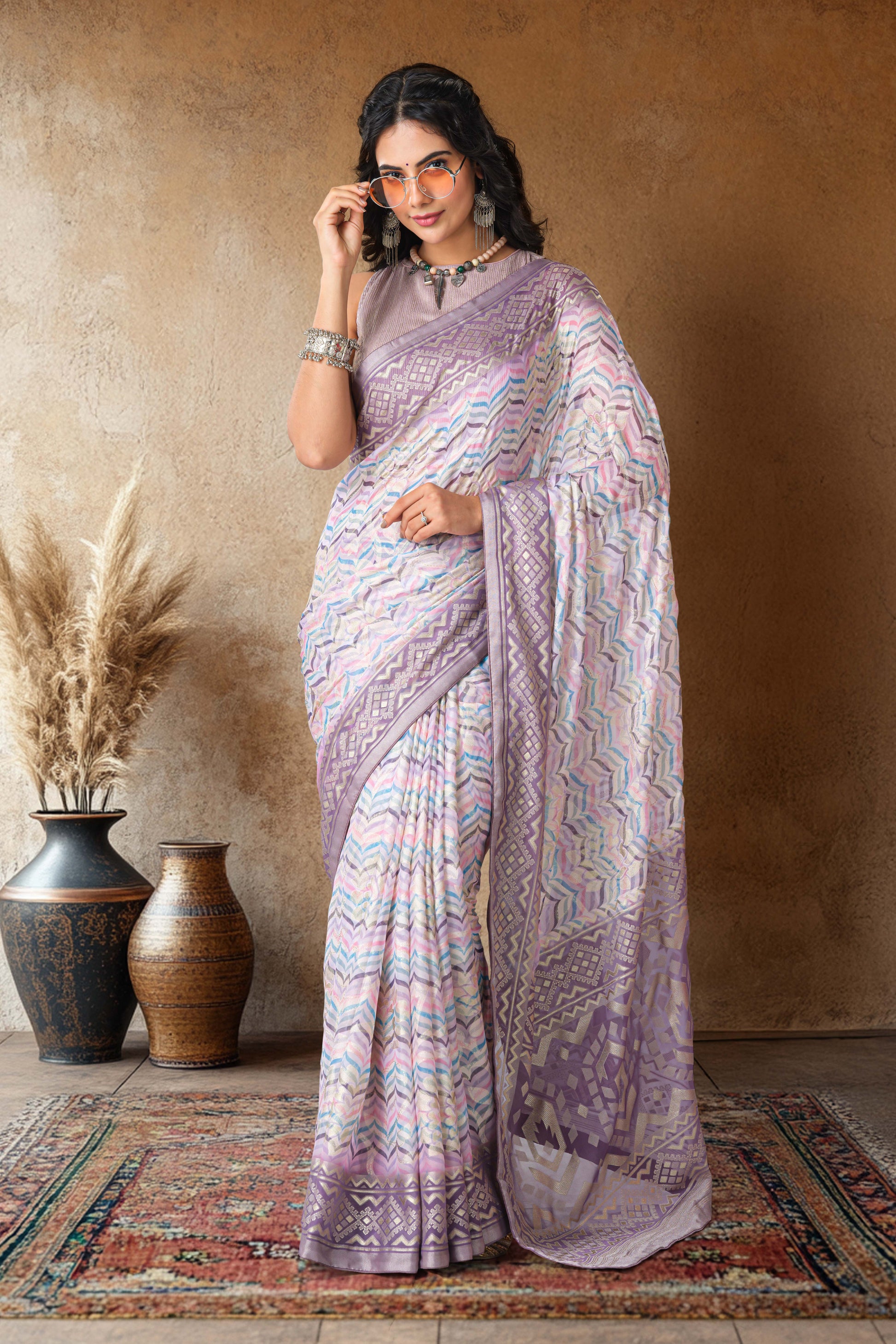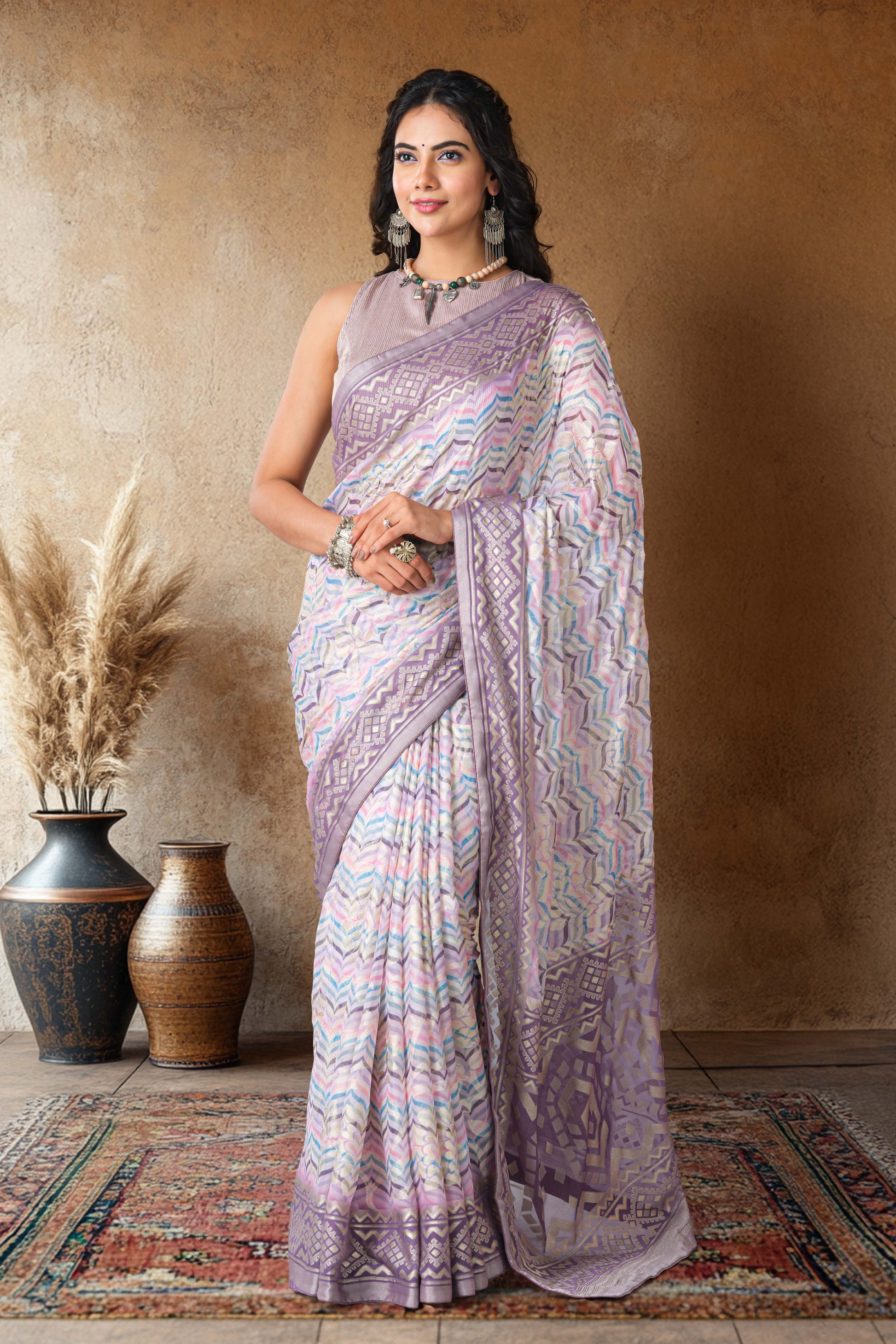 Lavender Brasso Saree Chevron Design & Foil Print With Contrast Rich Pallu