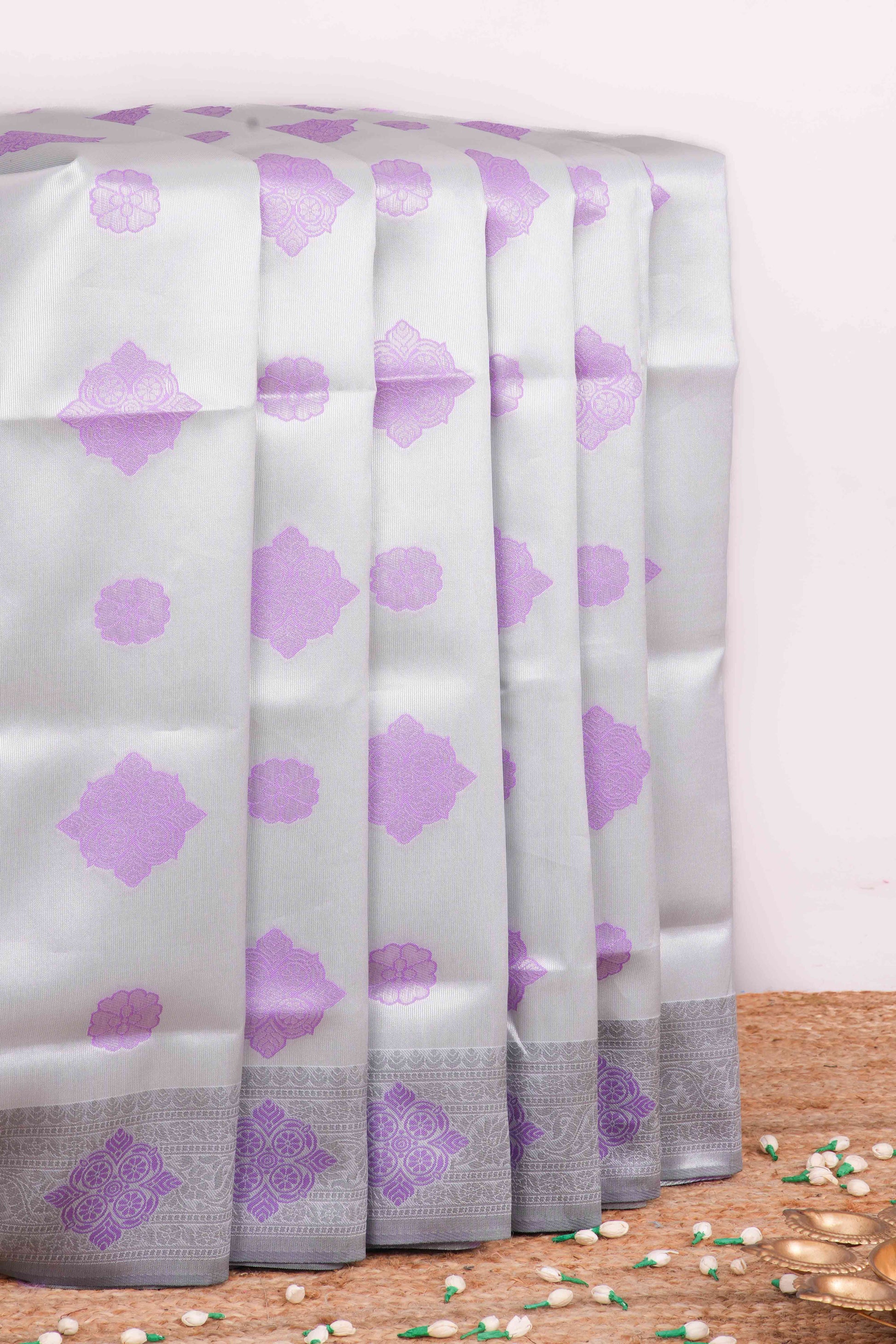Silver Lichi Tissue Silk Saree Butta & Contrast Pallu