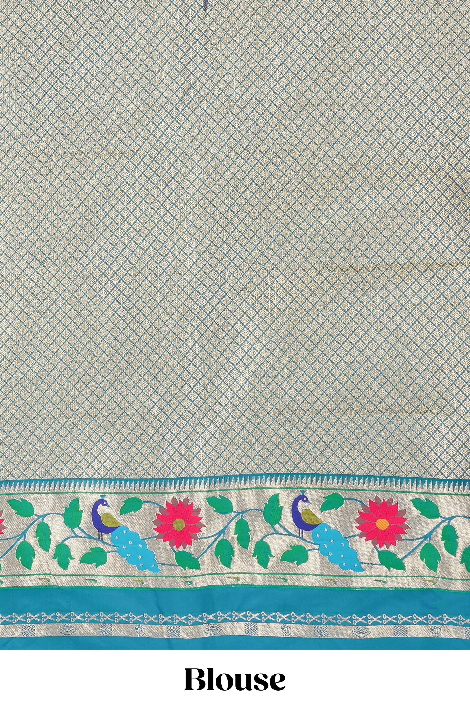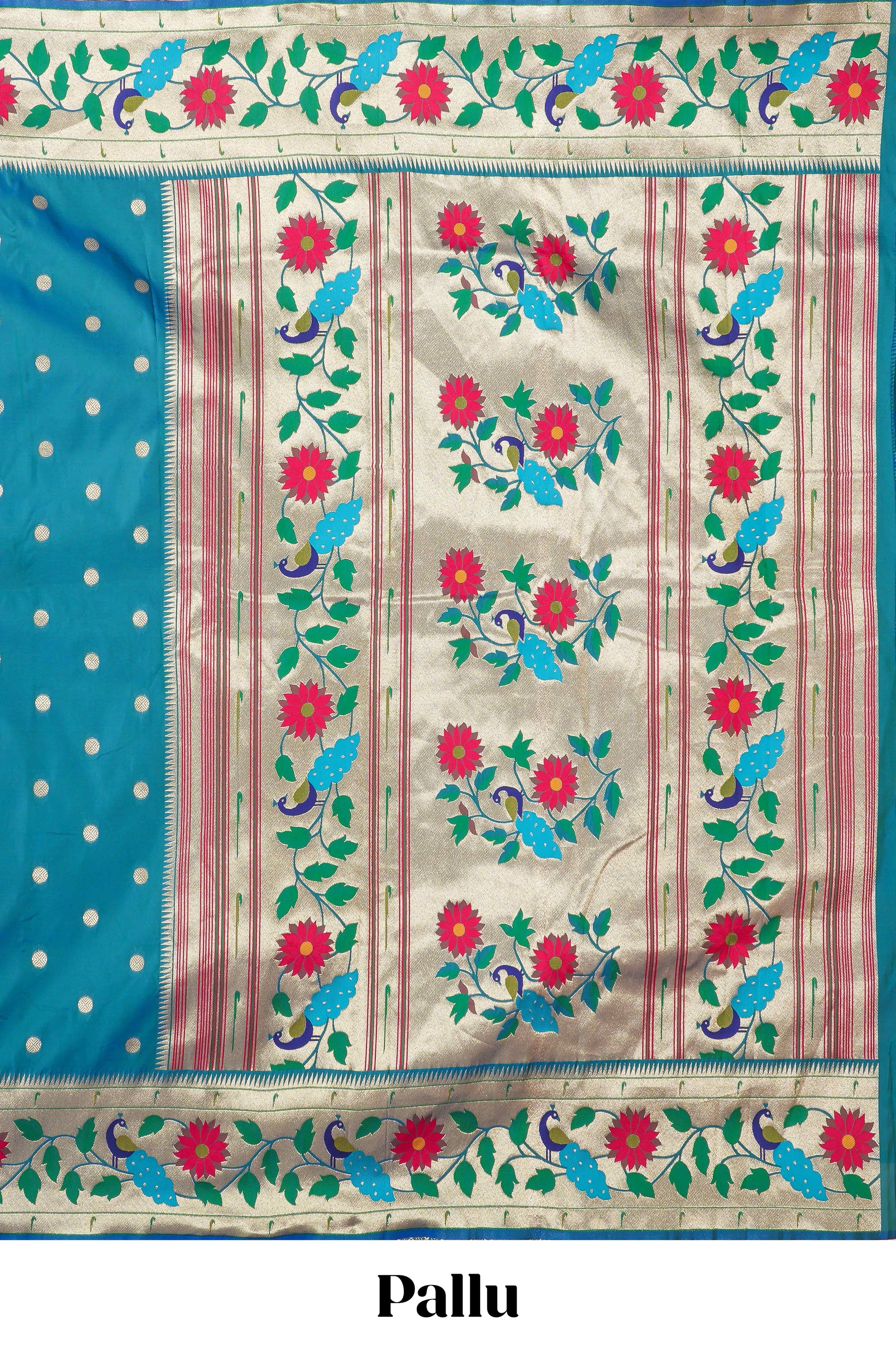 Peacock Blue Art Silk Saree Golden Zari Paisa Motifs Across The Body & Paithani Pallu Along With Blouse