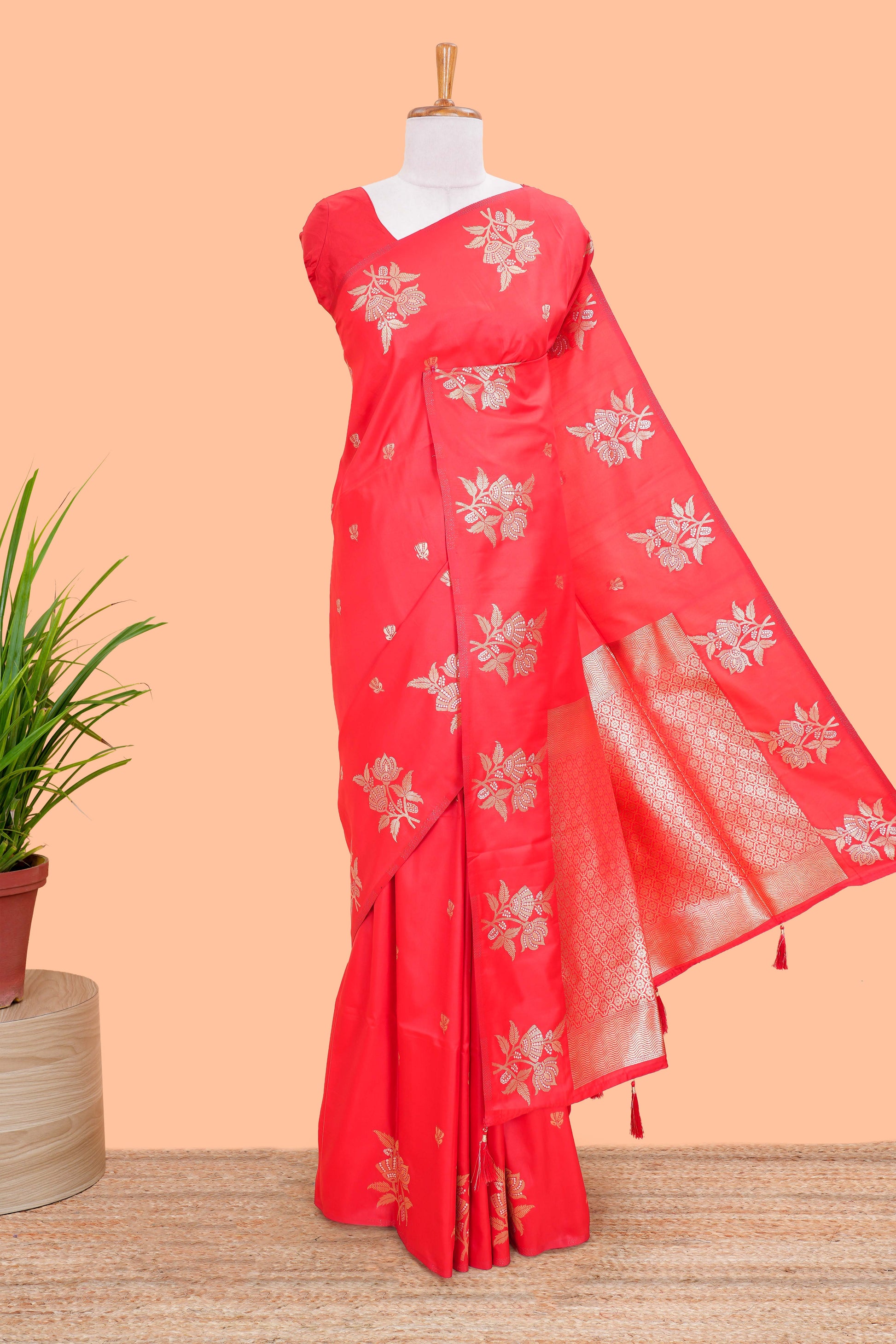 Red Art Silk Saree Flower Zari Motifs Across The Body &Jaal Design Pallu Along With Blouse