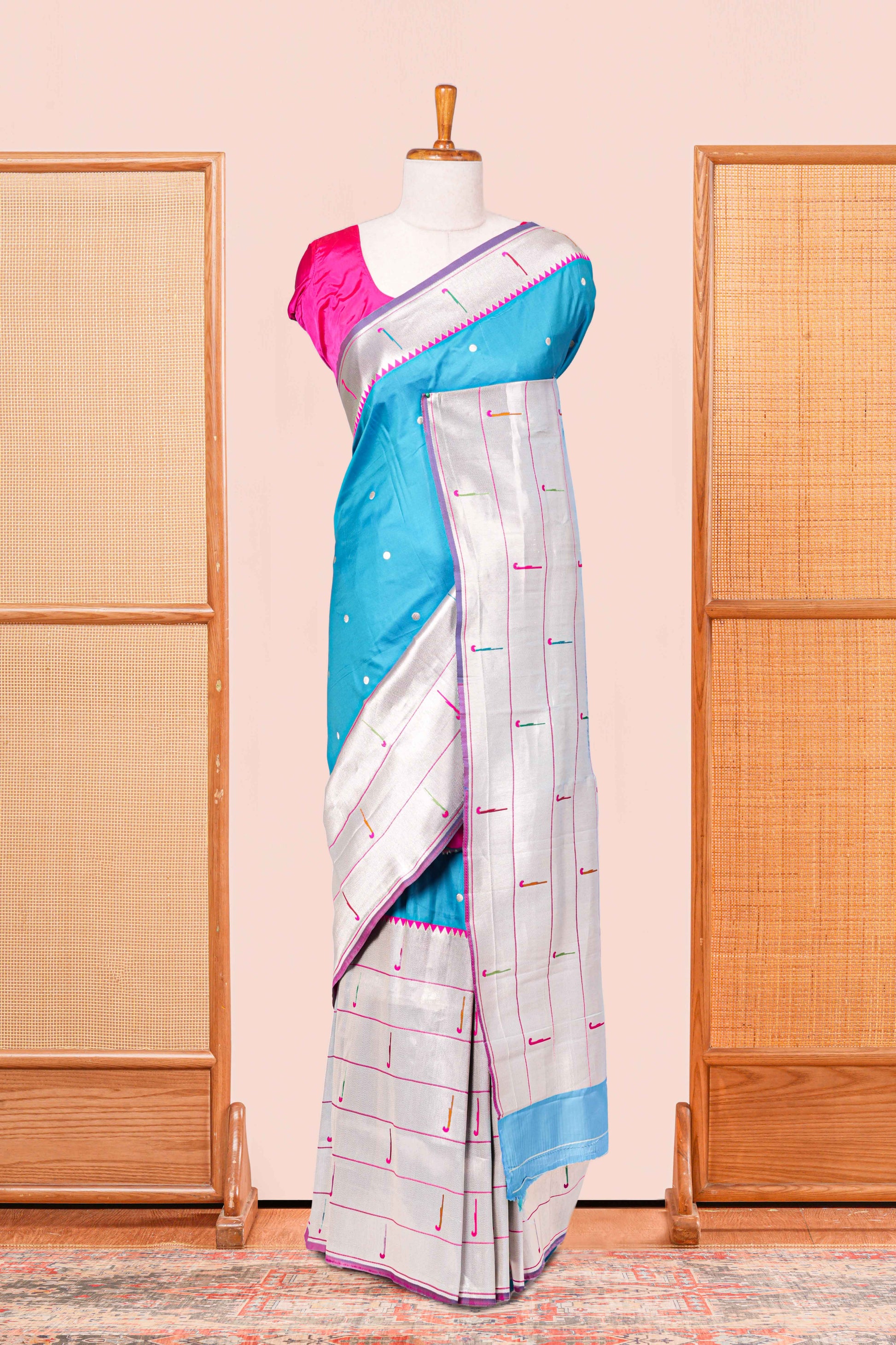 Blue Art Silk Saree With Paisa Motifs Spread Across The Body & Rich Silver Zari Border. Floral Design Pallu Along With Silver Zari Blouse