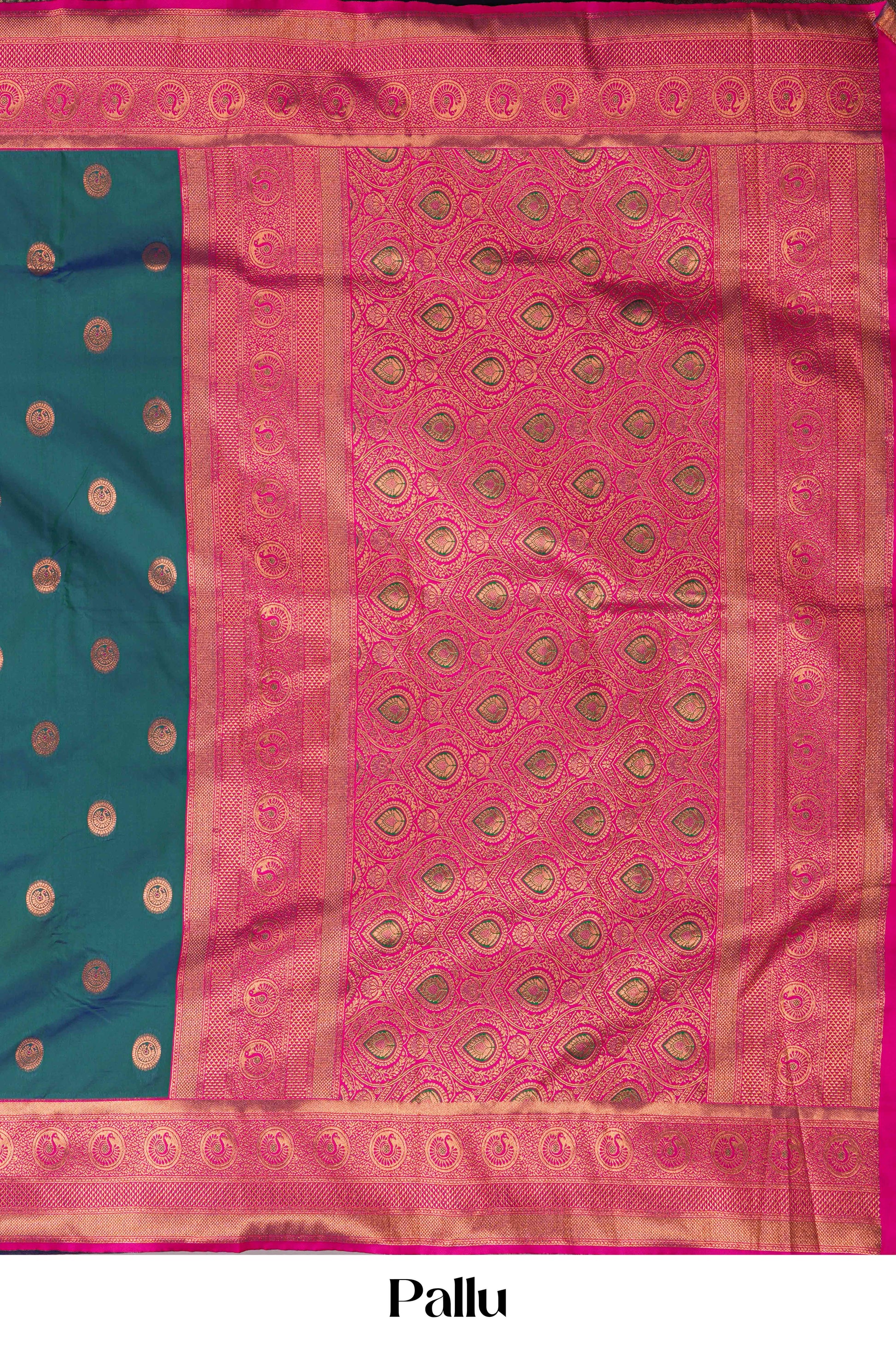 peacock green Art Silk Saree With Paisa Mayi Buttas Spread Across The Body & Rich Traditional Gold Zari Border. Contrast Zari Weaving Pallu Along With Contrast Kathir Button Blouse