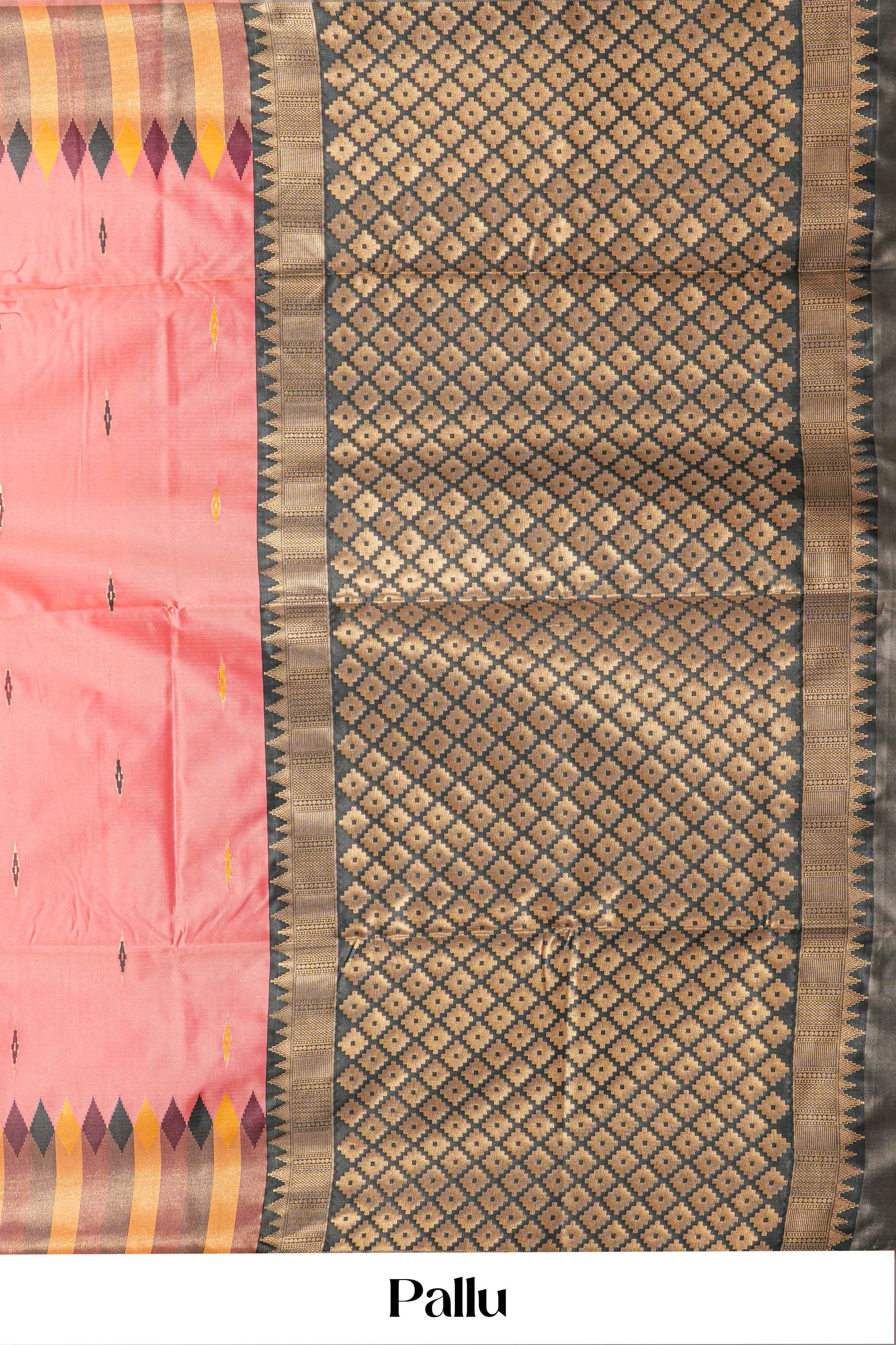 Peach Art Silk Saree Body Detailing Butta & Highlighted With Multi Colour Temple Design Border & Rich Golden Zari Small Diamond Motifs Pallu Along With Contrast Butta Design Blouse