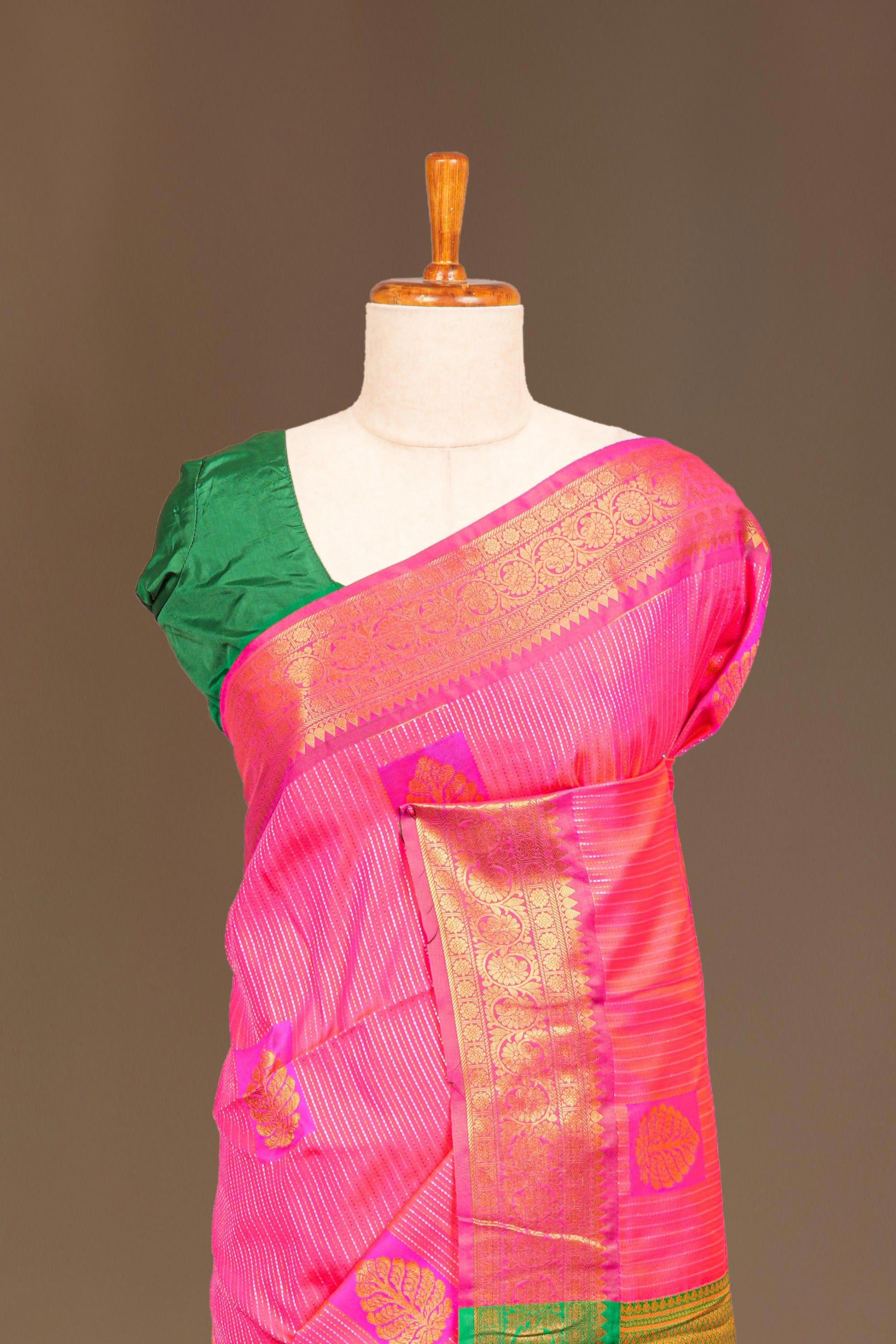 Art Silk Saree With Gold Zari Weaving ,Leaf Zari Motifs Spread Across The Body & Rich Traditional Gold Zari Border. Contrast Pallu Floral Design With Contrast Blouse