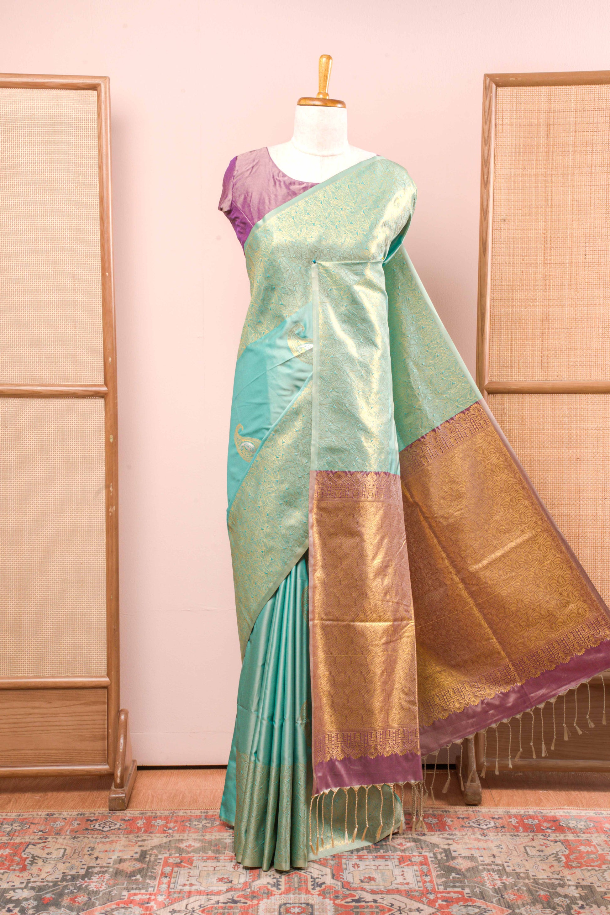 Teal Blue Art Silk Saree Body Detailing Plain Finish With Minimal Zari Butta. Highlighted Contrast Zari Weaving Pallu Along With Contrast Blouse