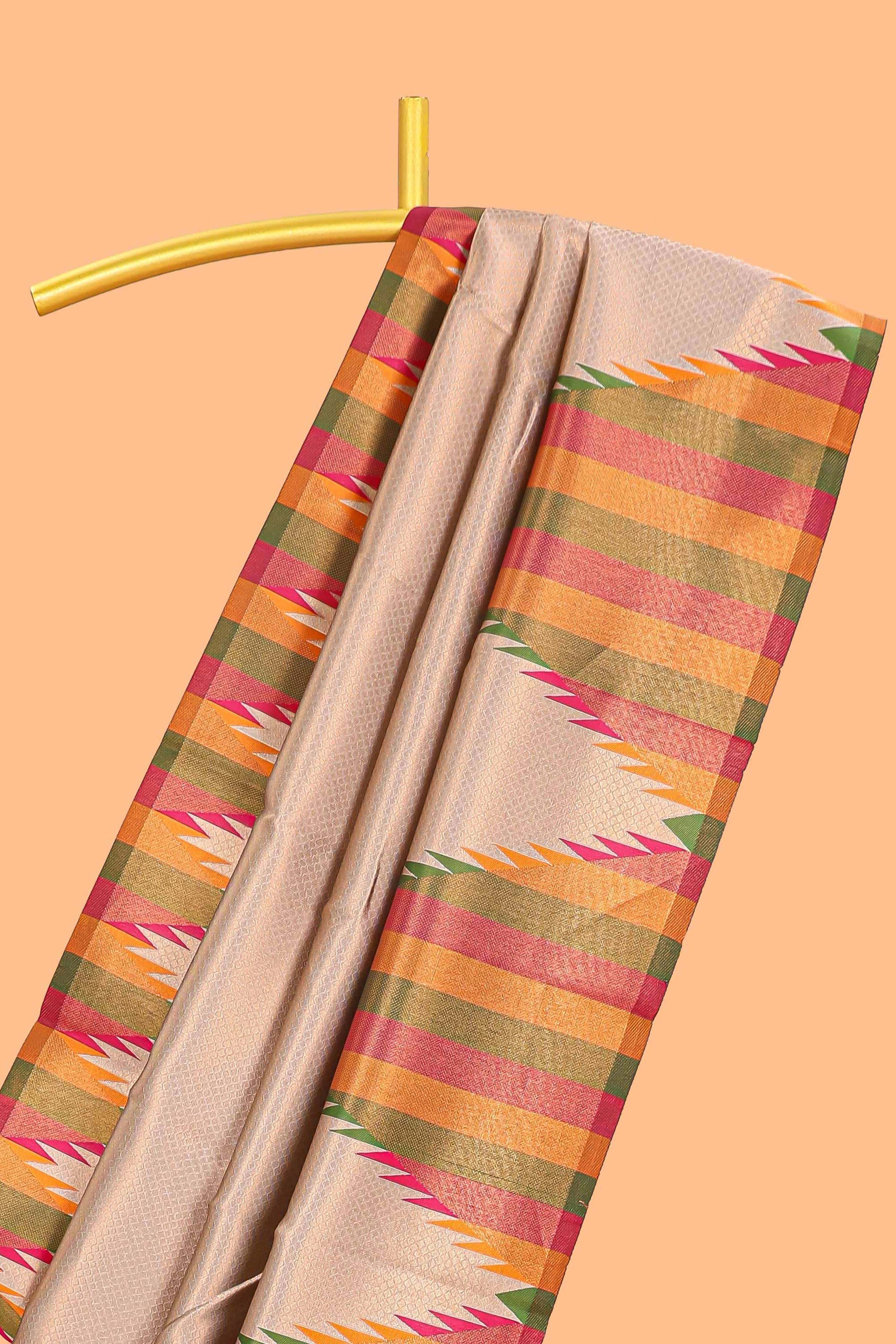 Beige plain litchi silk saree with contrast multi color ikkat style border and blouse