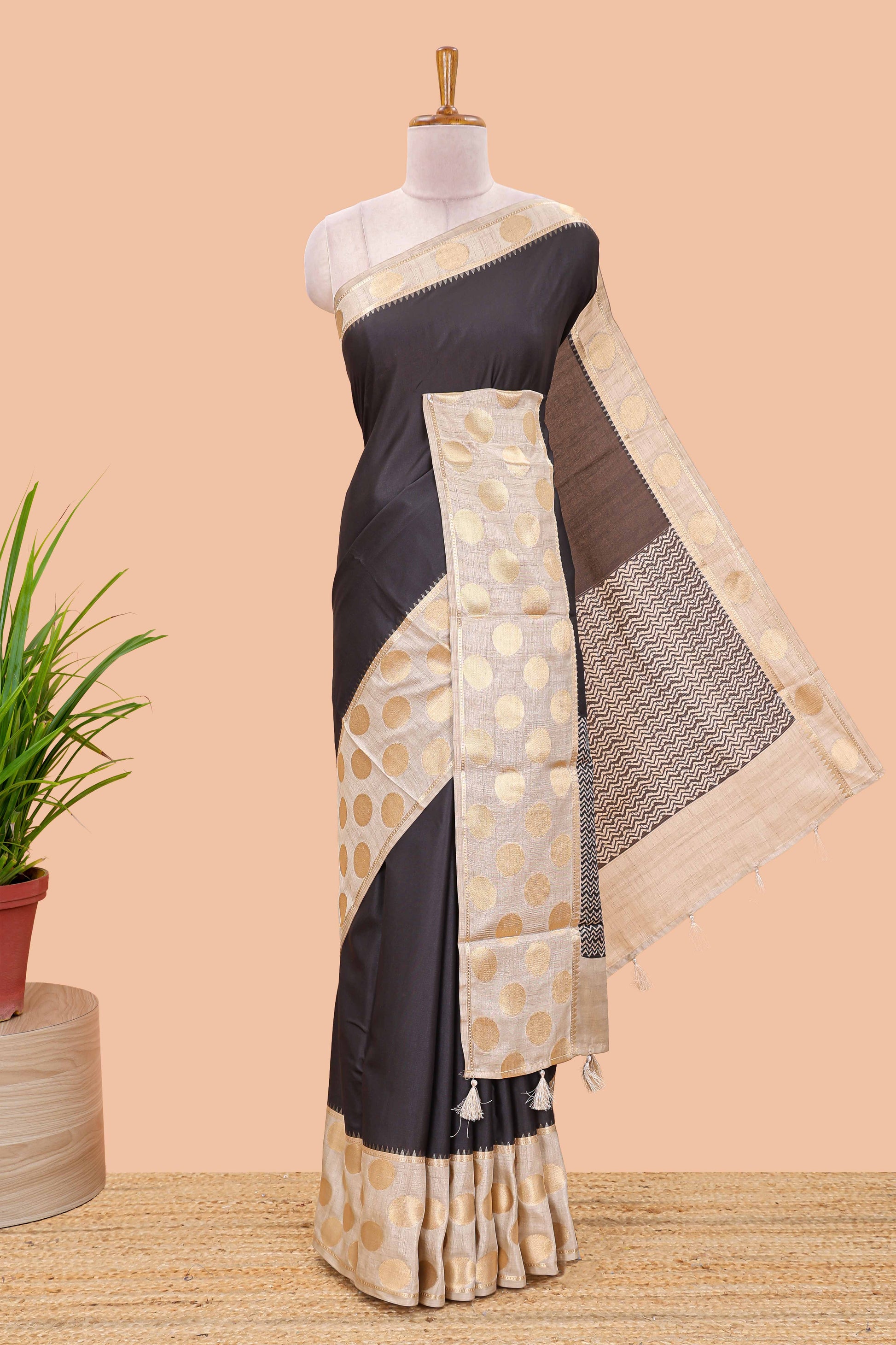 Black art tussar saree with plain body, cream coin motif zari border and zig-zag printed pallu