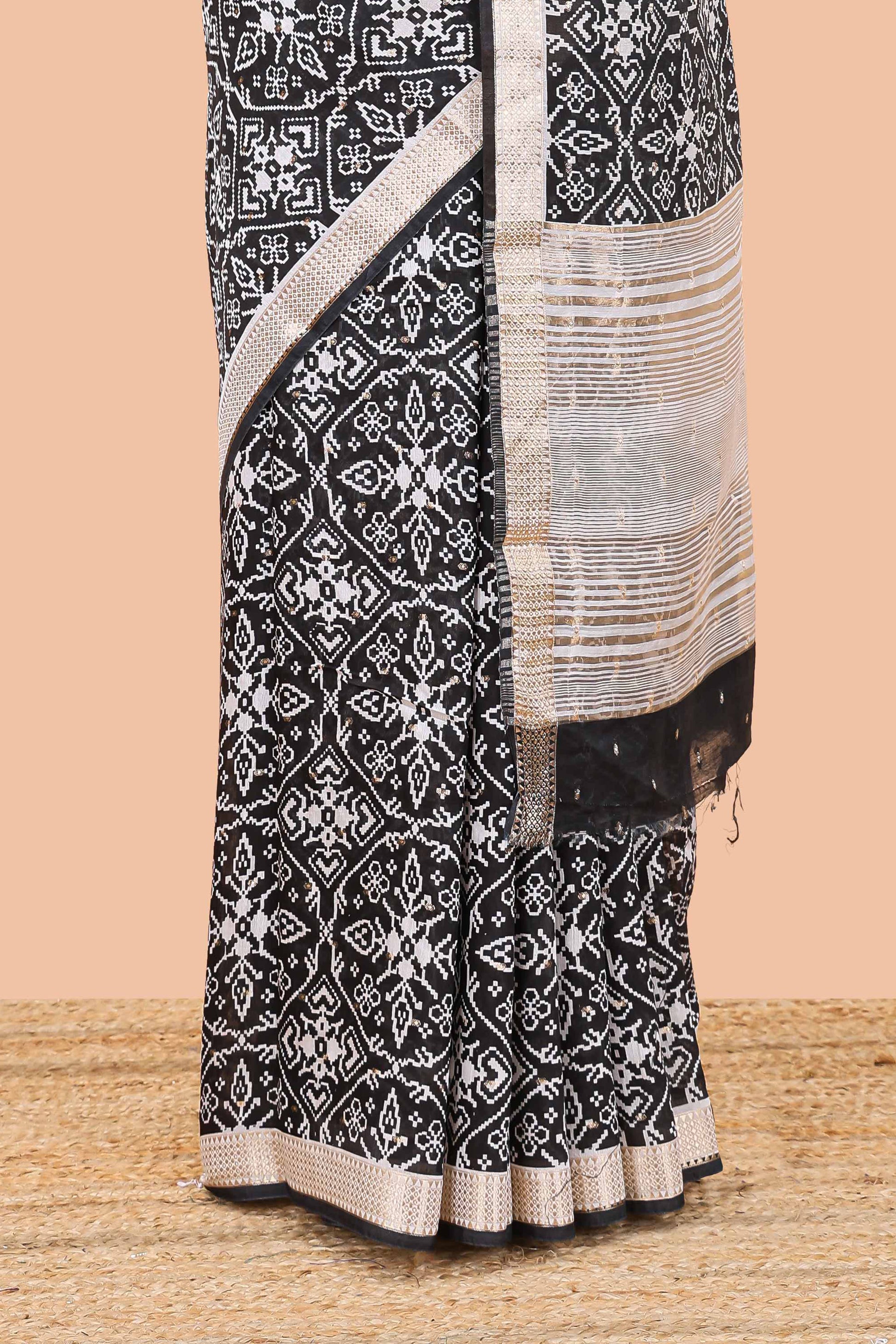 Black assam silk saree with all over ikkat style print, stripe pallu and zari border