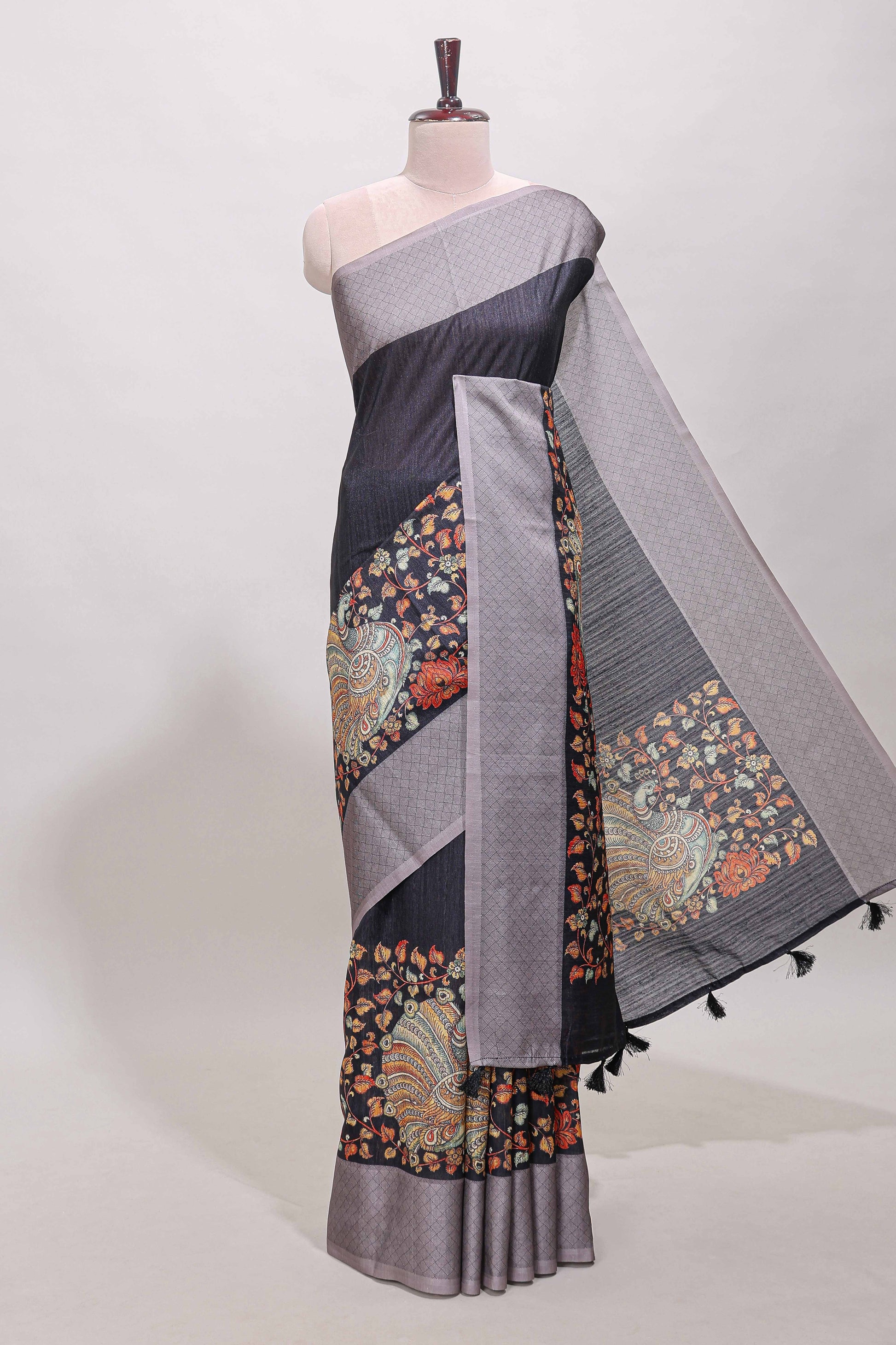 Black floral and peacock design linen cotton saree with contrast border and printed blouse