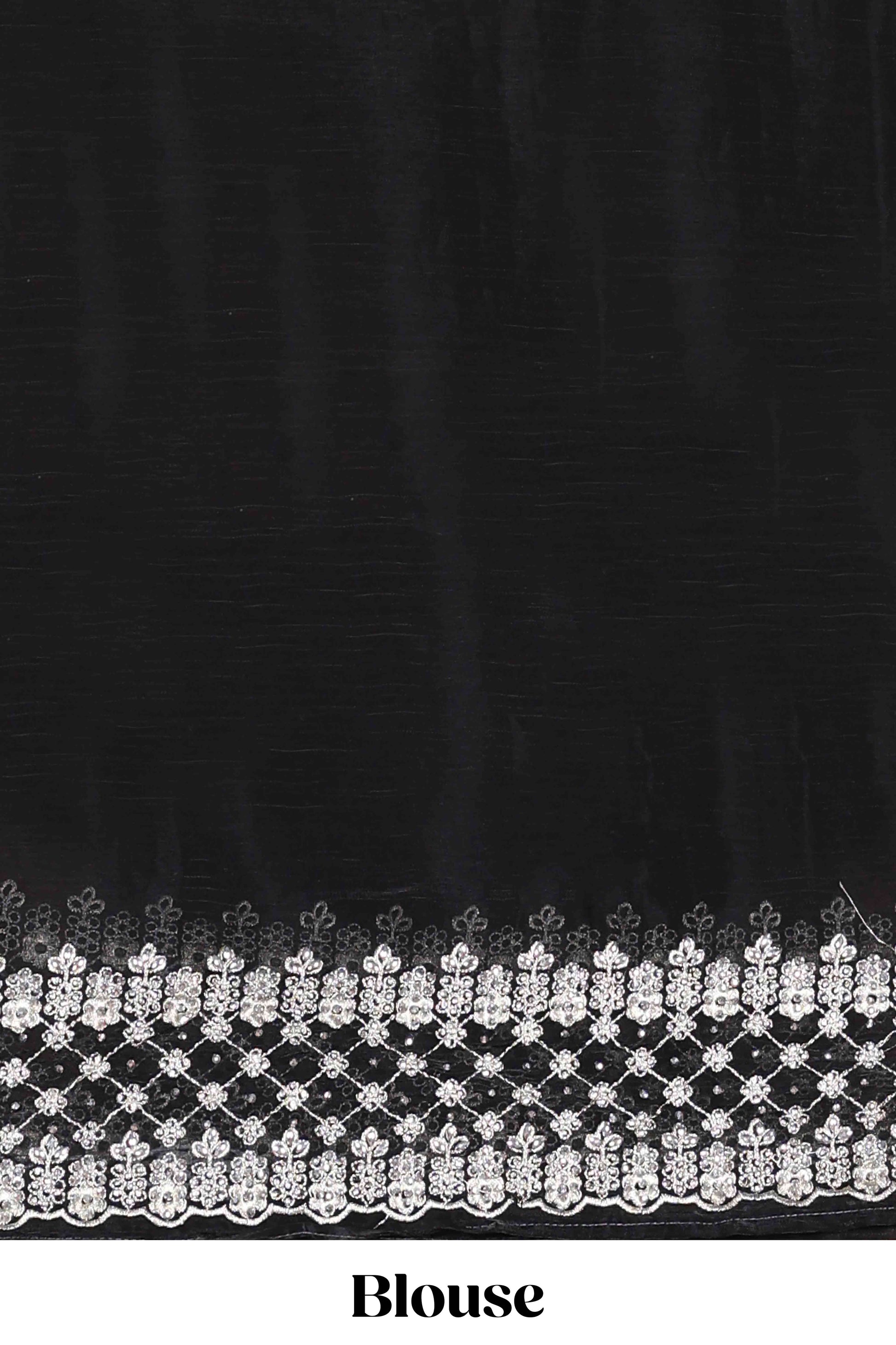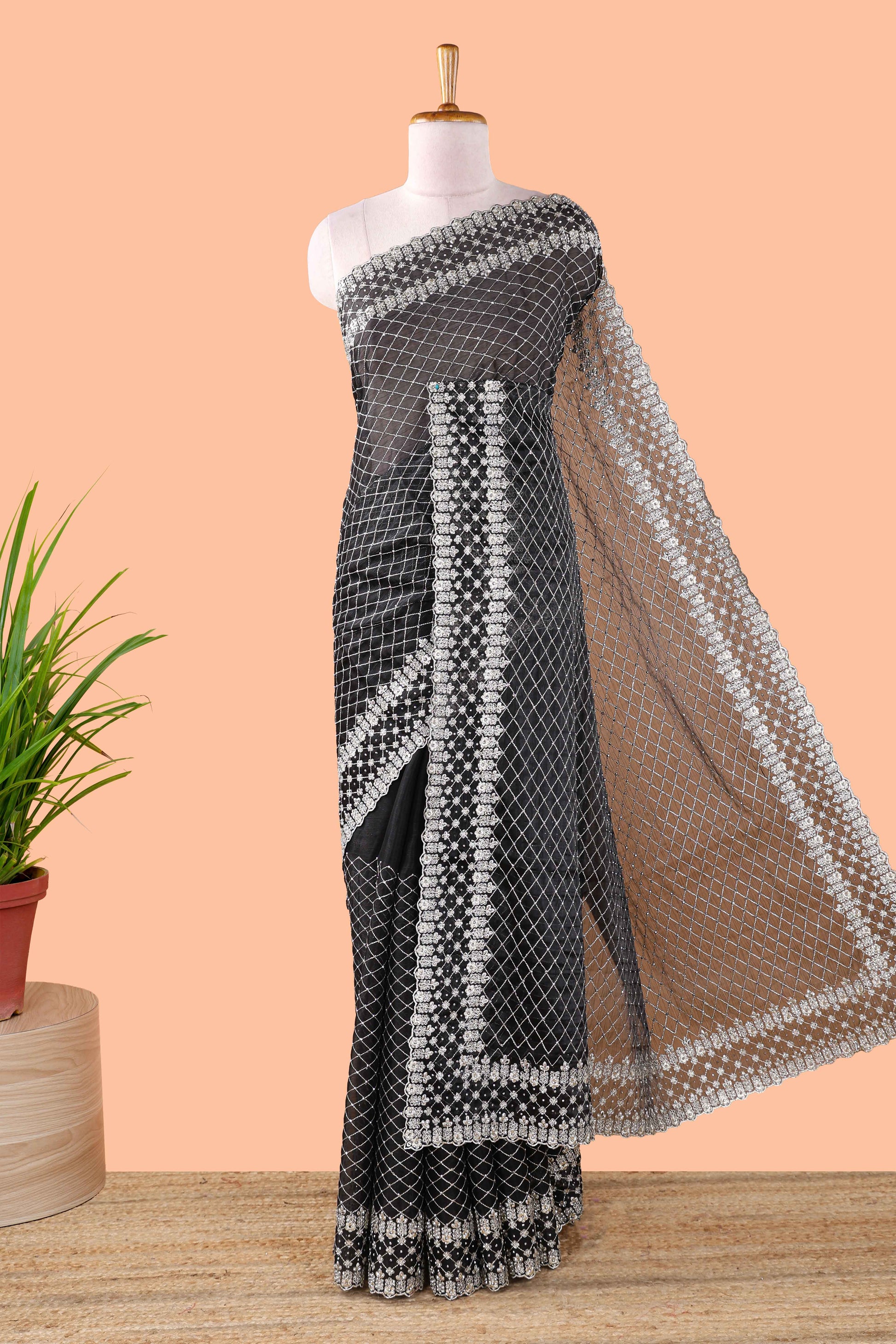 Black geomentric fendi chiffon embroidery design saree with self pallu and blouse