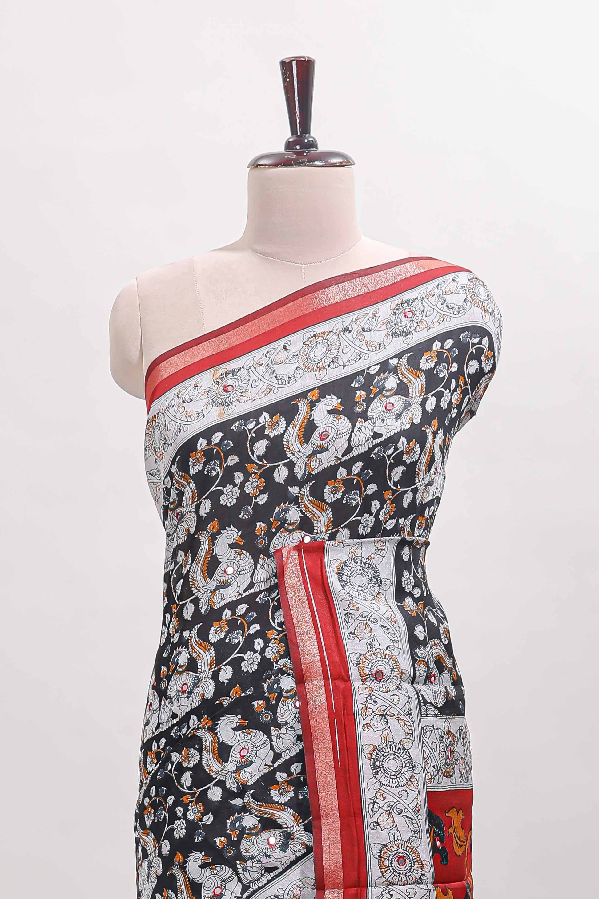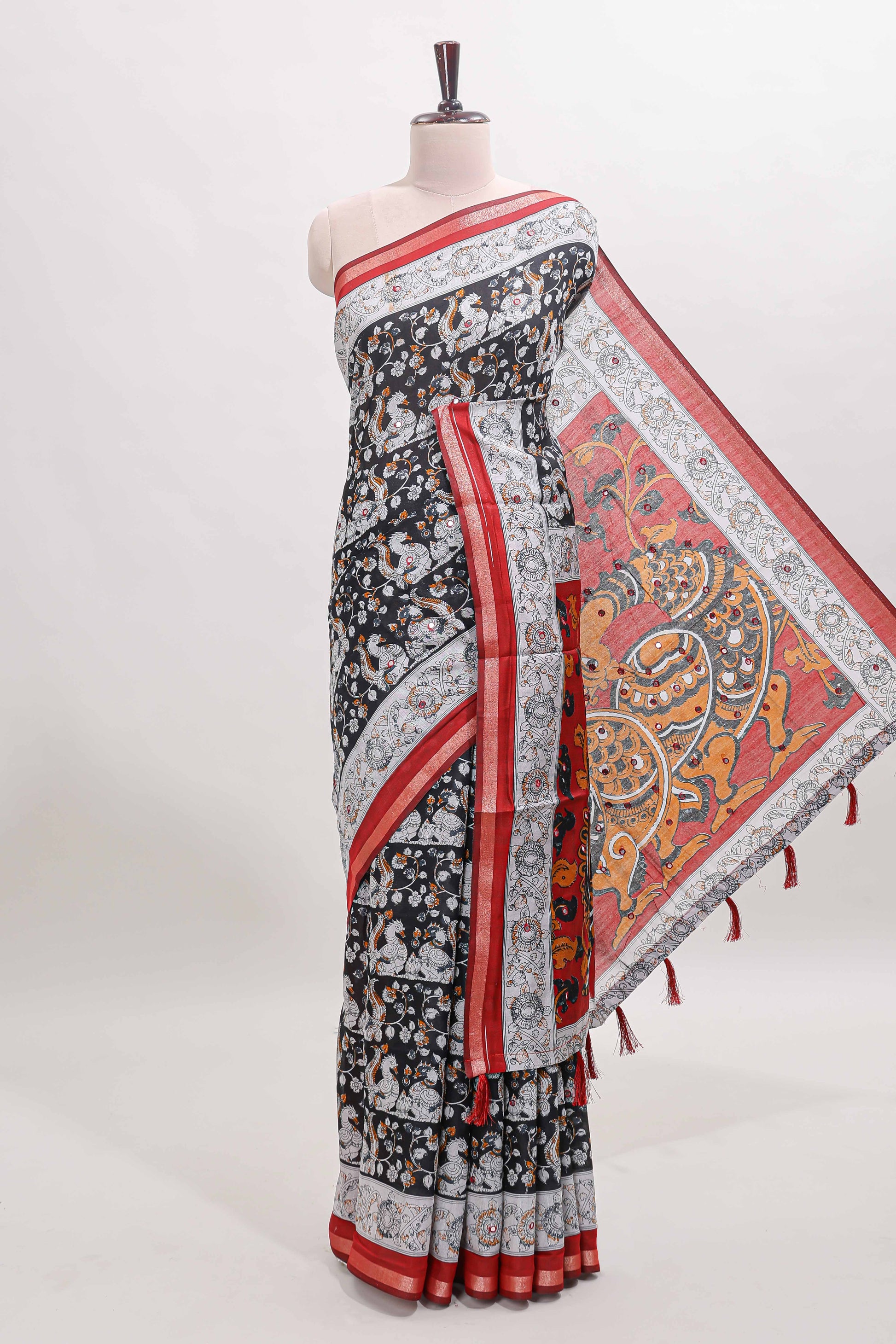 Black kalamkari style chanderi cotton saree with contrast border and blouse