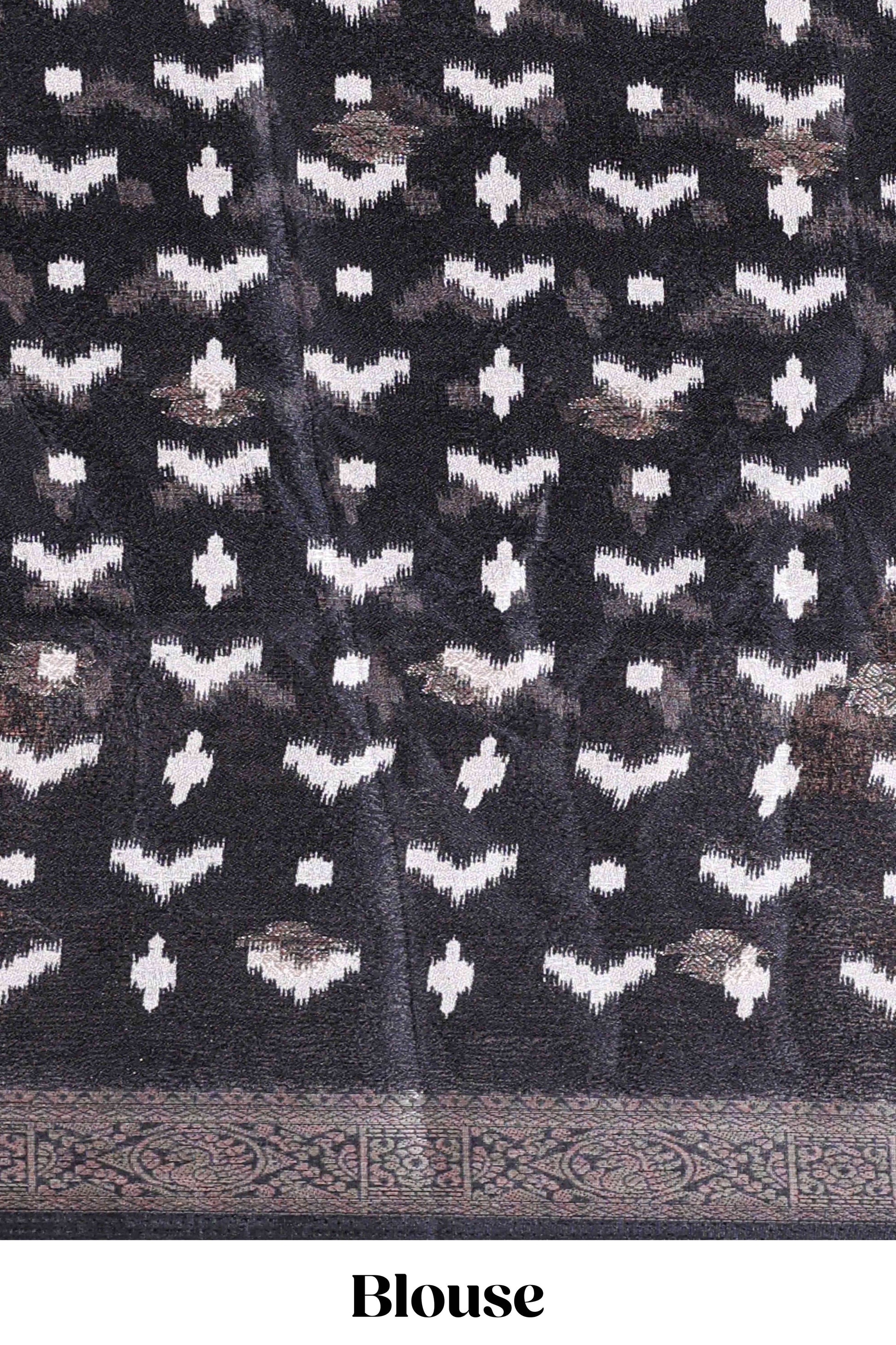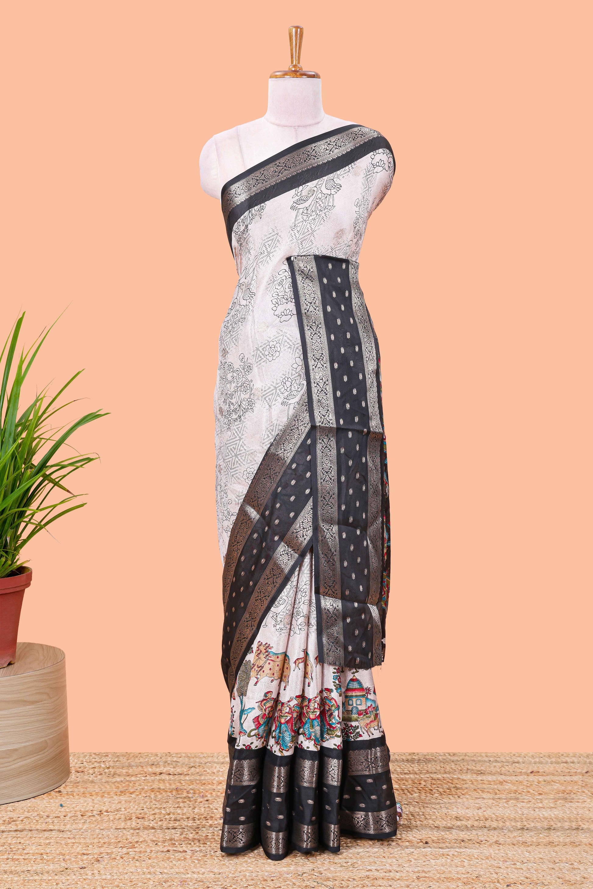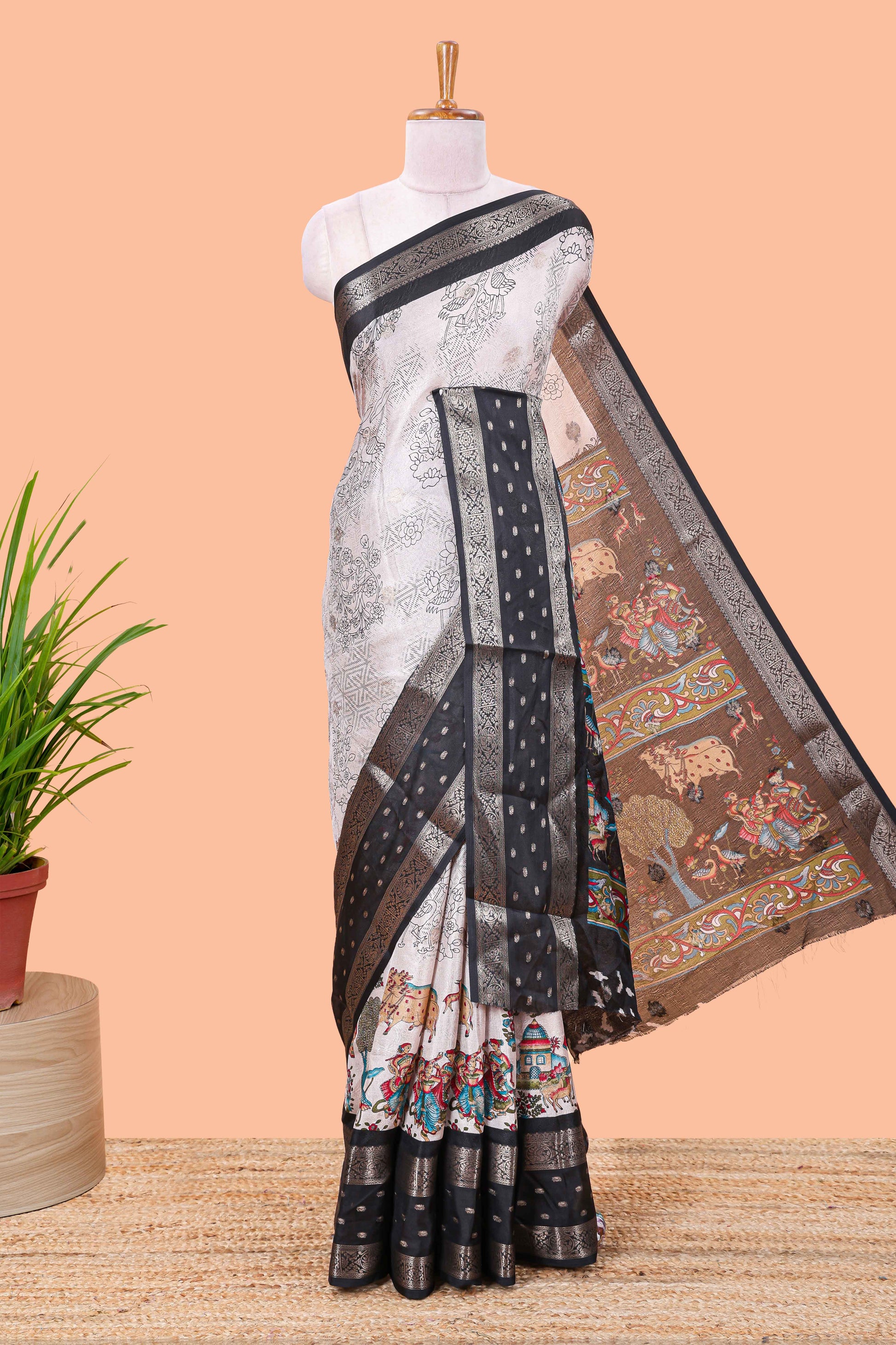 Black Mars Georgette Body Floral Print With Contrast Bentex Border Above Kalamkari Print With Kalamkari Pallu