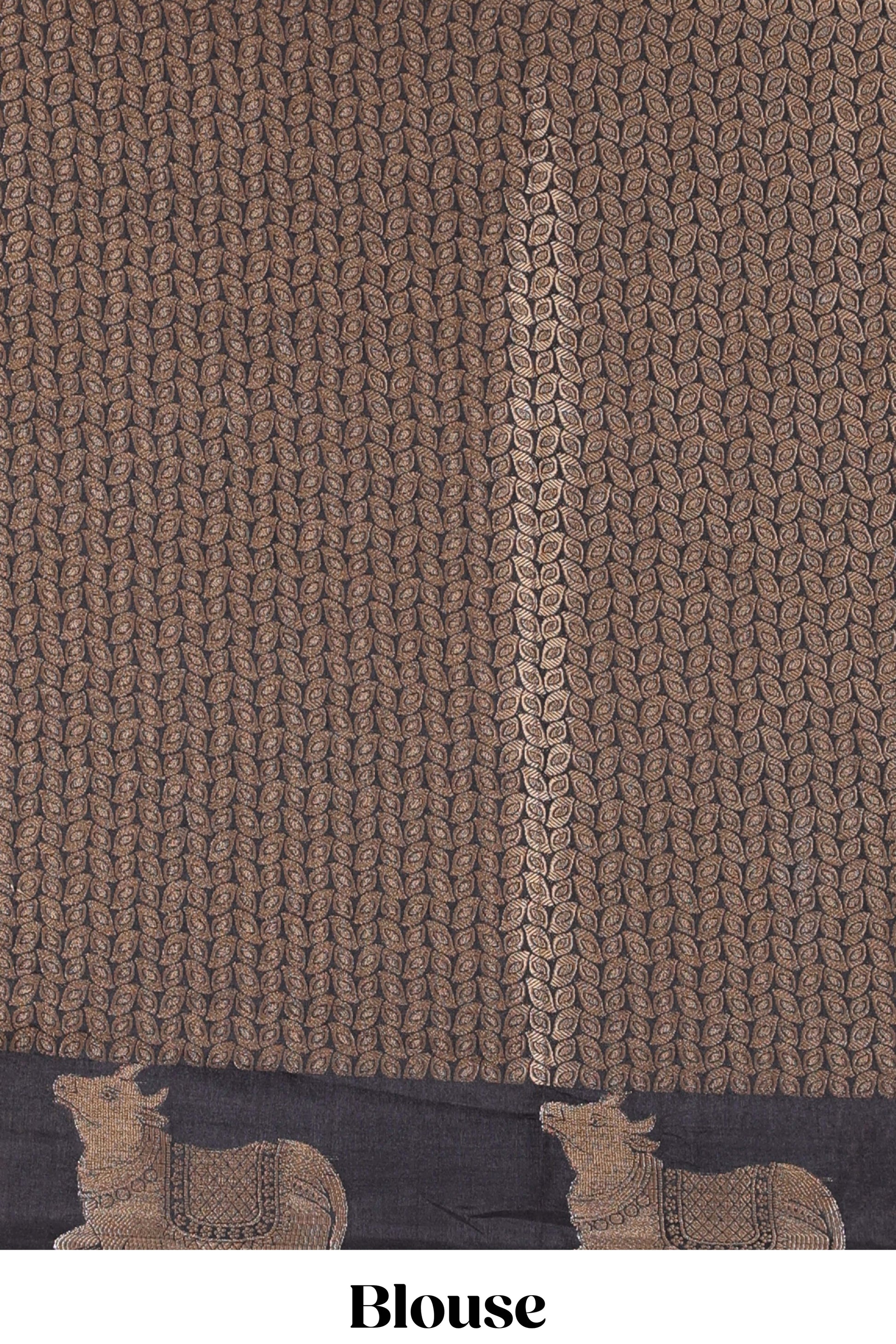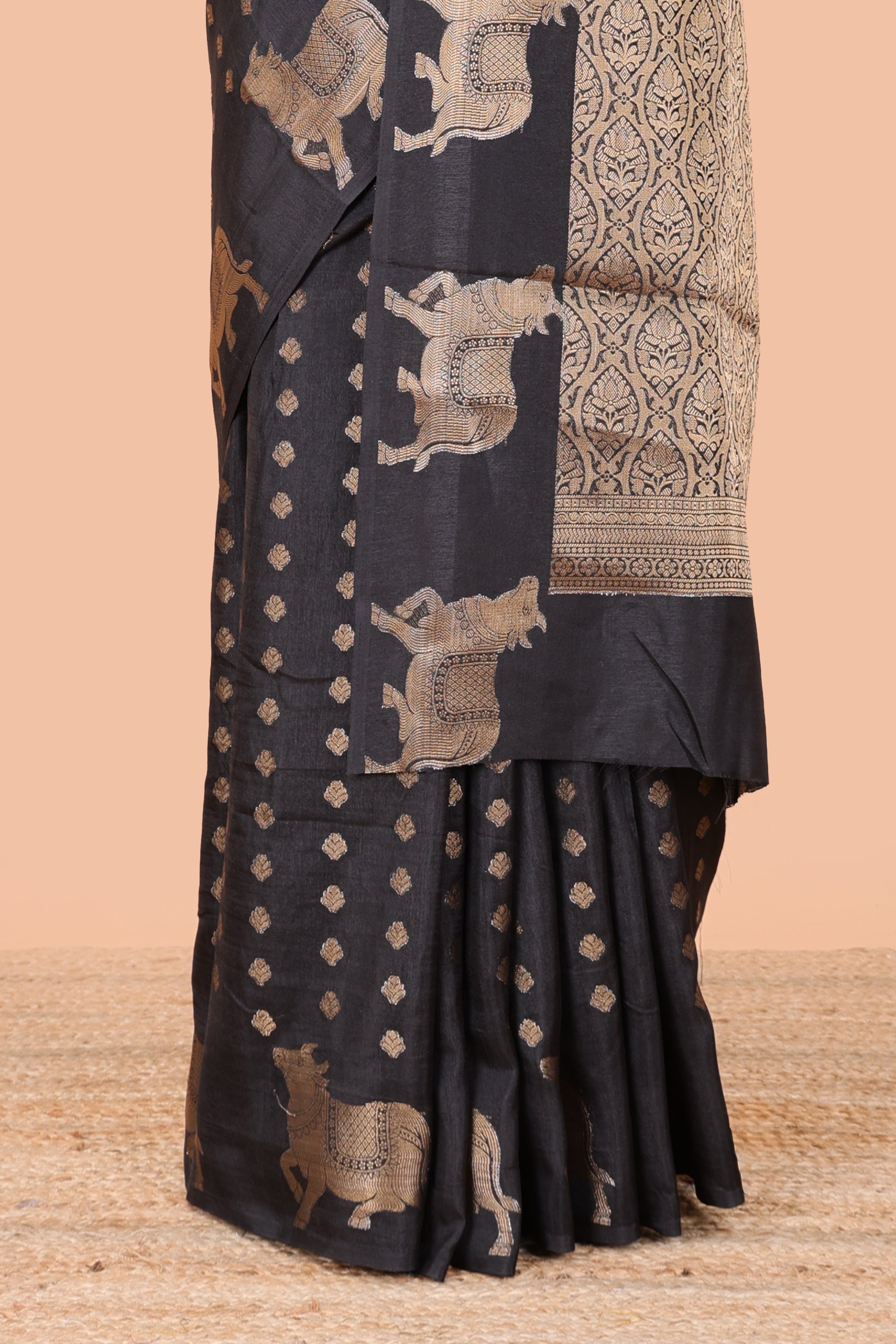 Black viscose dola silk saree with zari butta weave, pichwai motif border and contrast blouse
