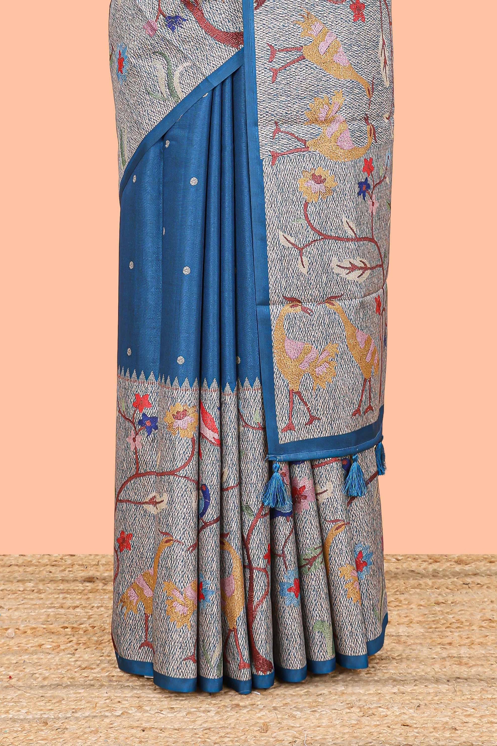 Blue art tussar silk saree with traditional dot print and paithani-style floral and animal motifs