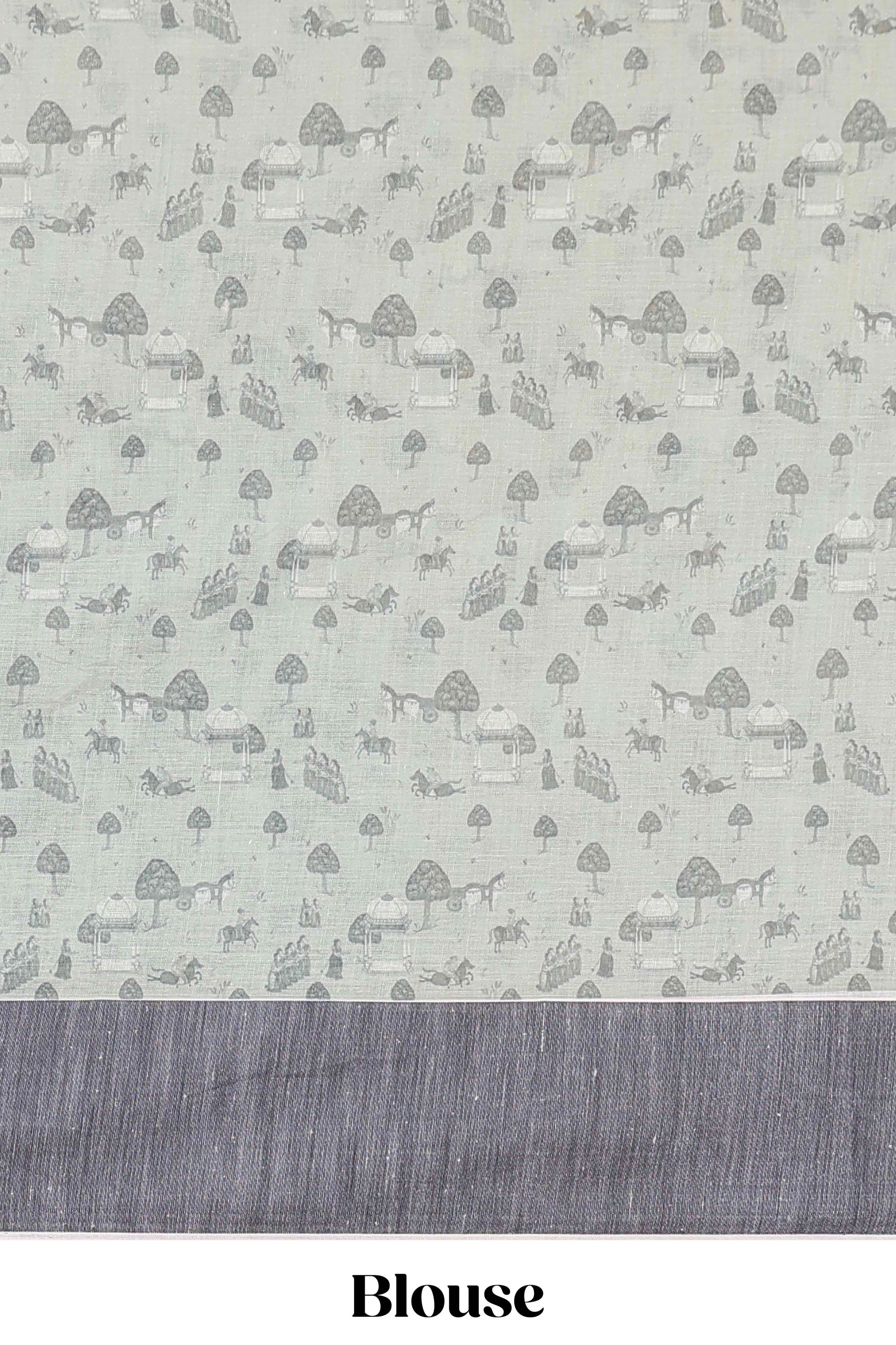 Green chirala cotton floral and animal theme digital print saree with zari border