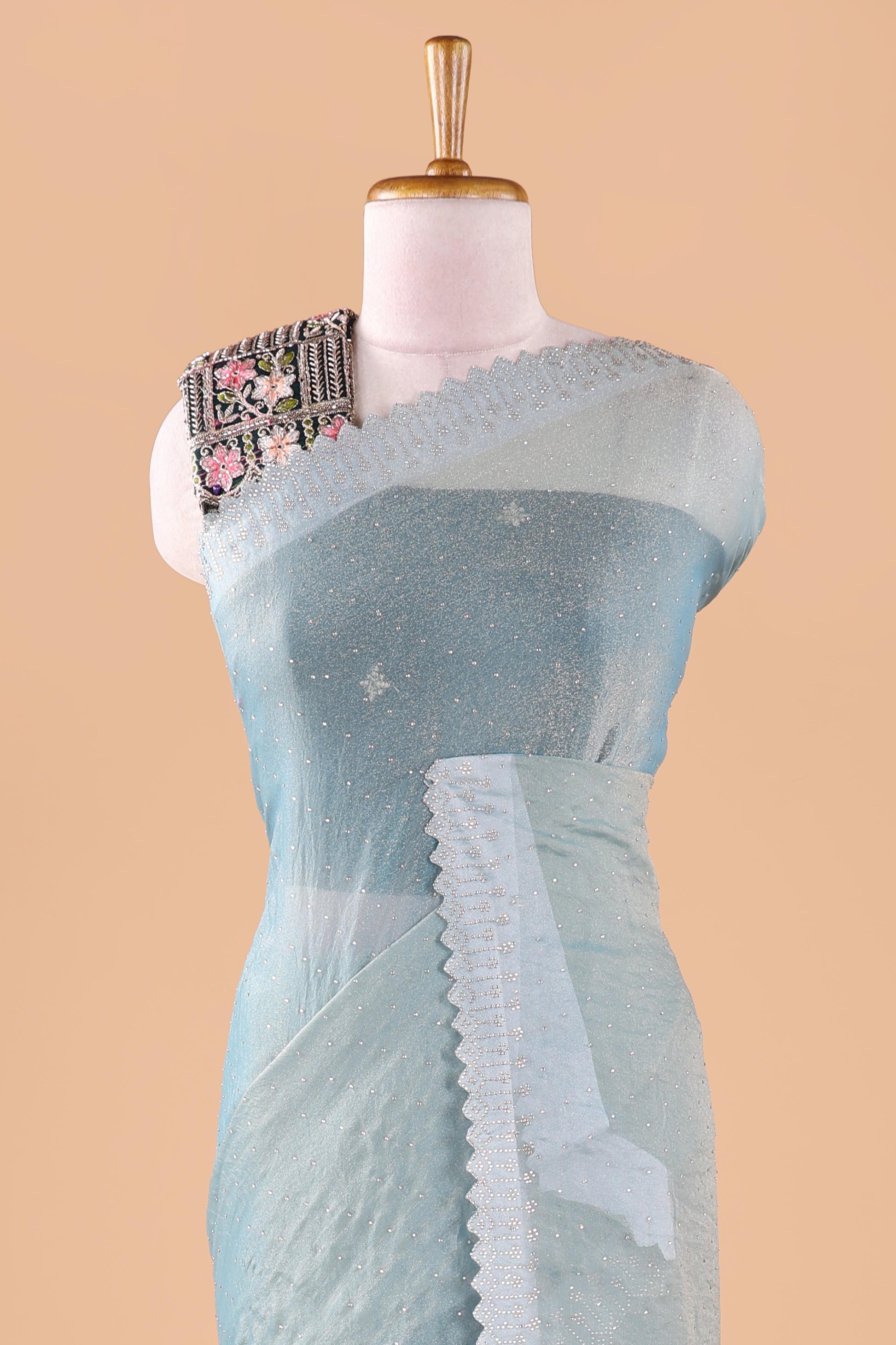 Blue designer georgette space silk saree with heavy stone & beads work, short pallu and contrast sequin embroidered blouse