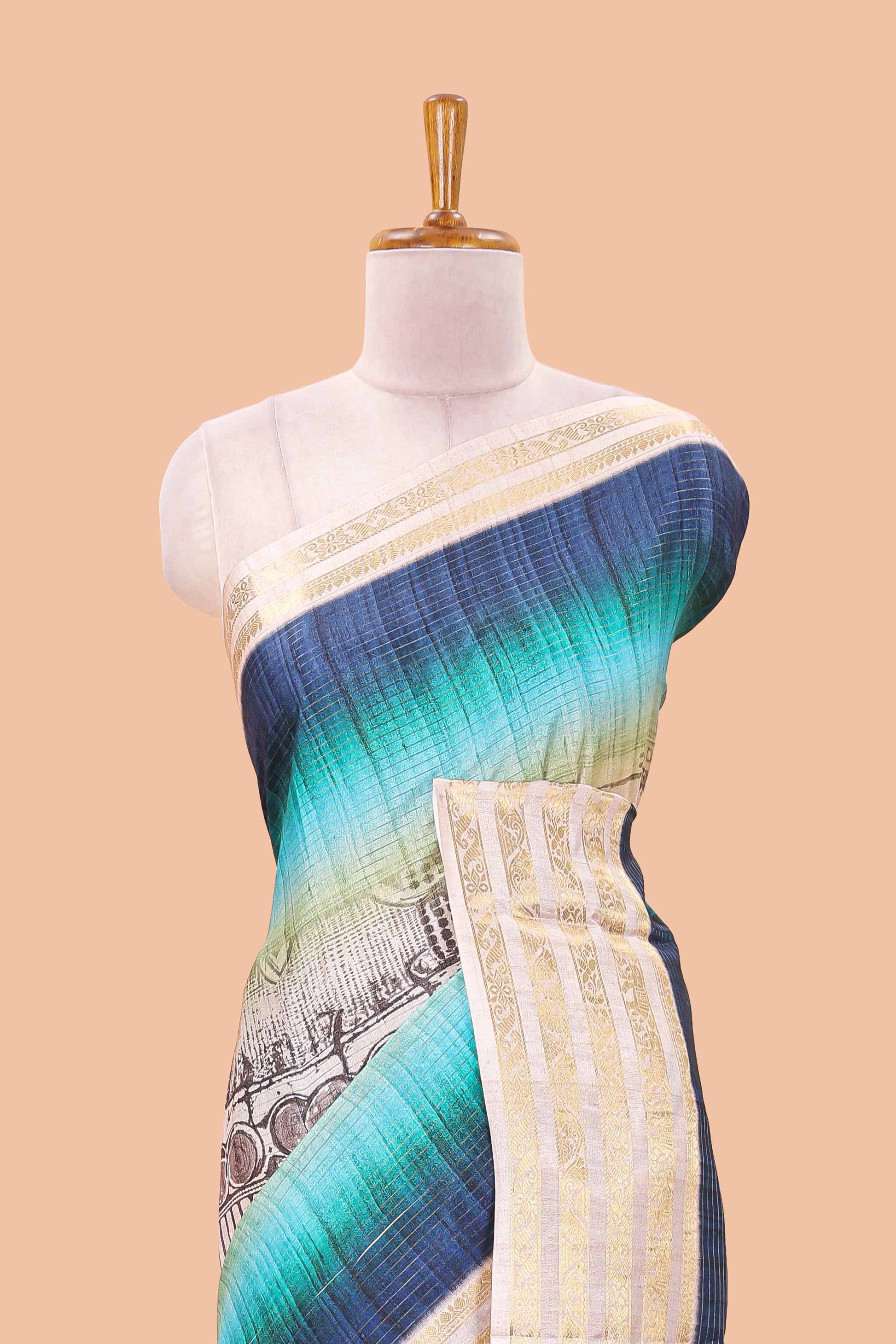 Blue dola silk saree with temple architecture print, zari striped pallu and border