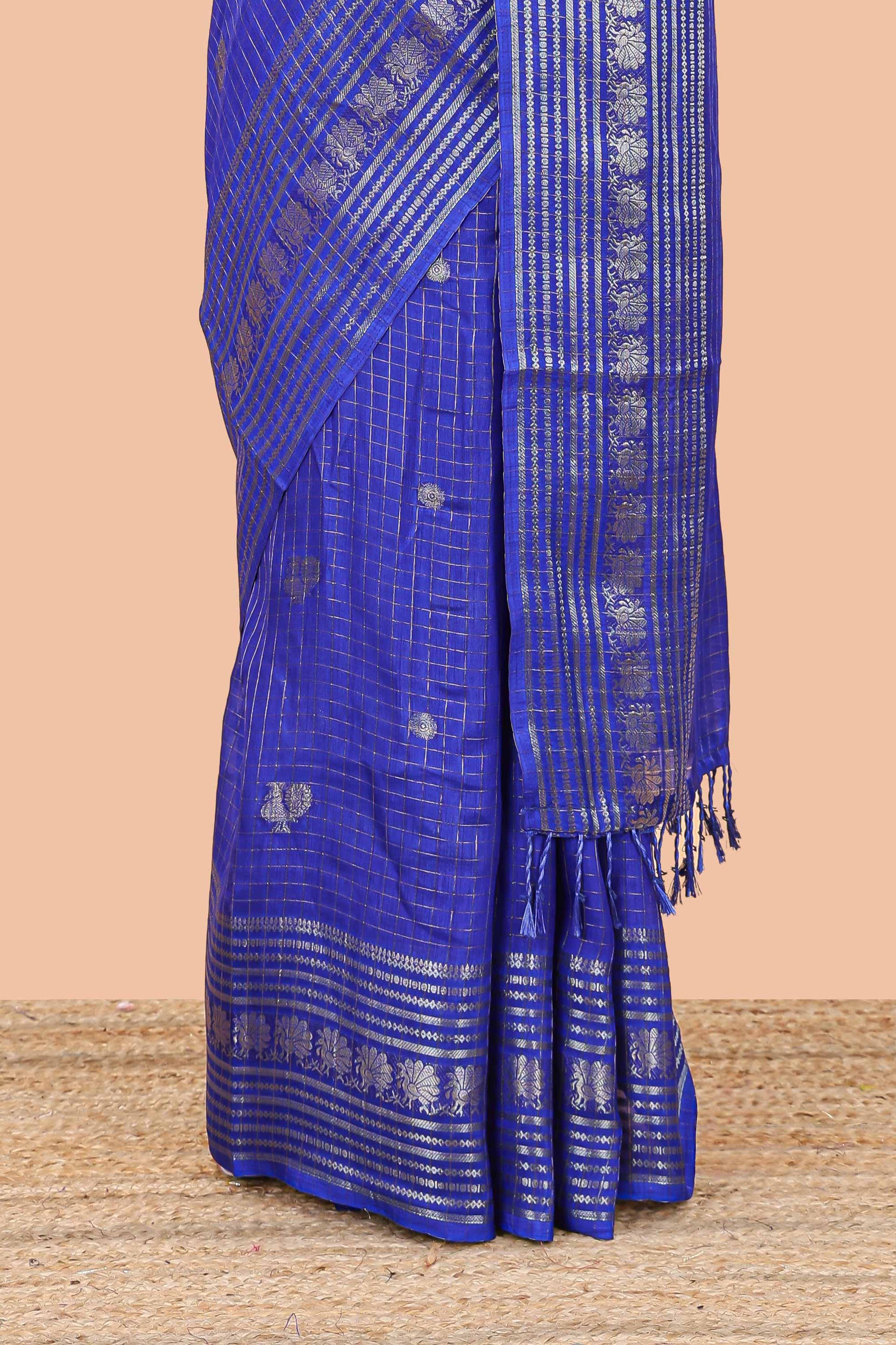 Blue dola silk saree with zari checks, peacock & coin motifs and zari peacock border