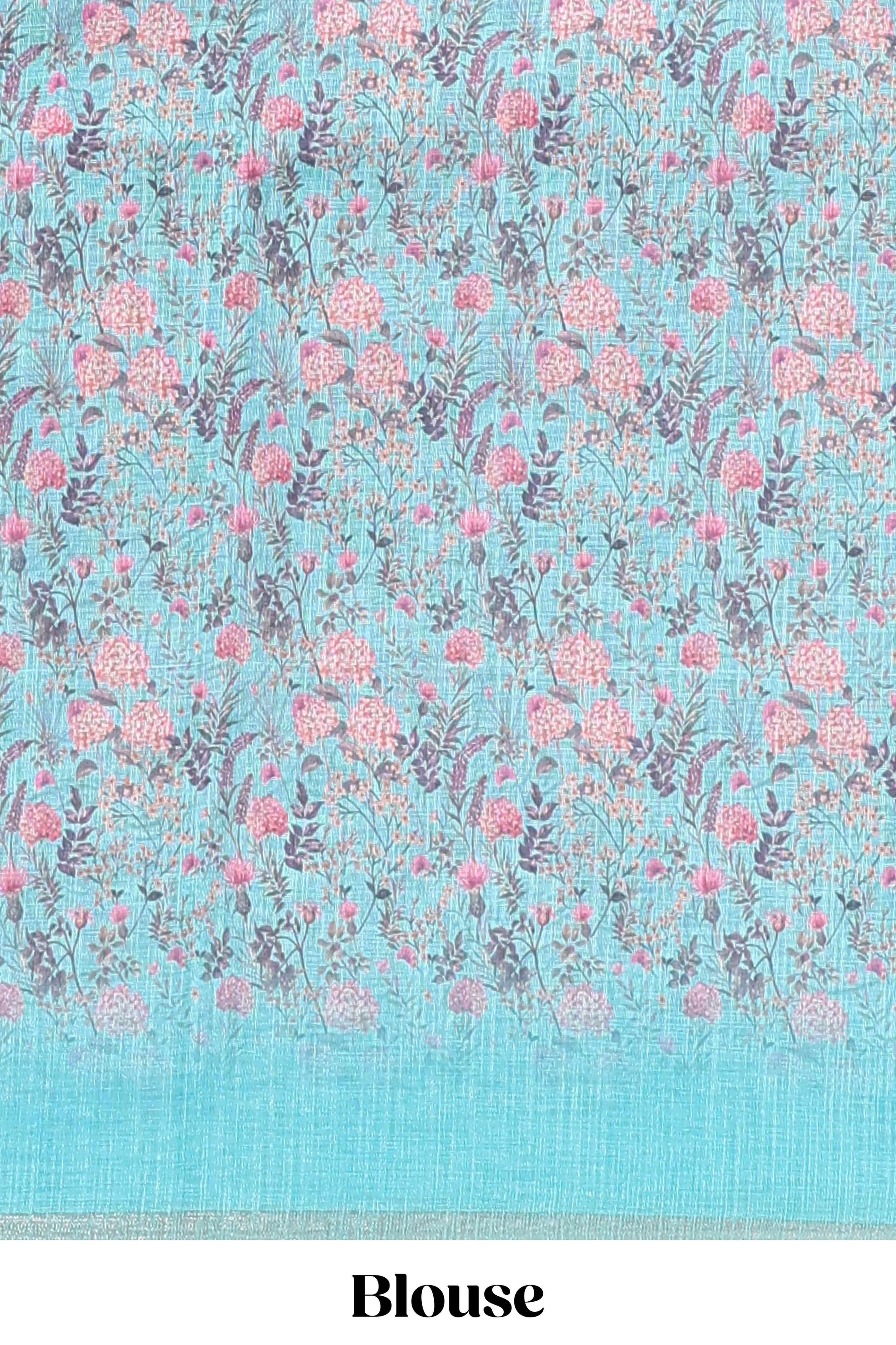 Blue floral design linen cotton saree with self zari border and floral printed pallu