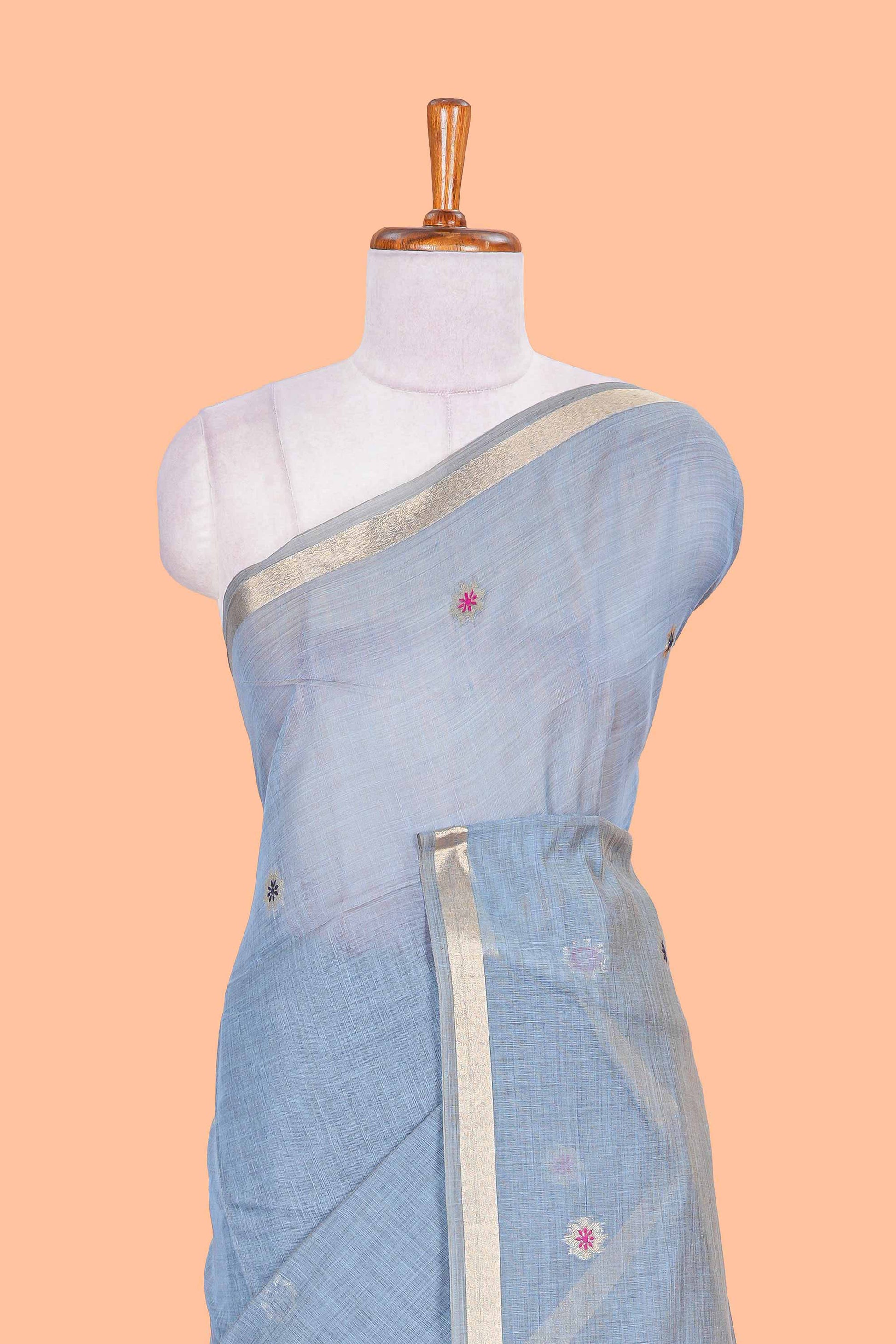 Blue floral design motifs munga cotton saree with self zari border and floral printed pallu