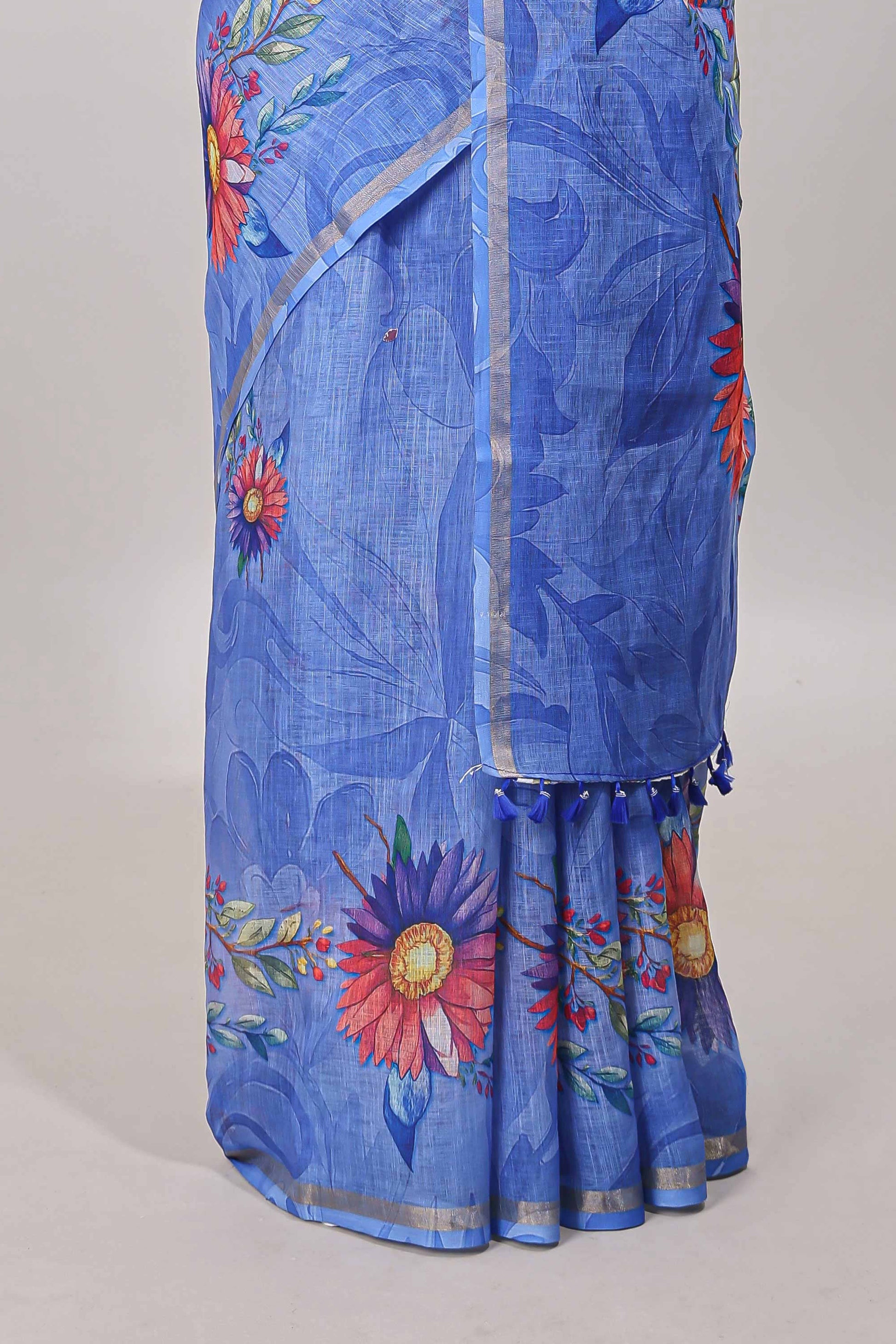 Blue floral print linen cotton saree with self zari border and matching blouse