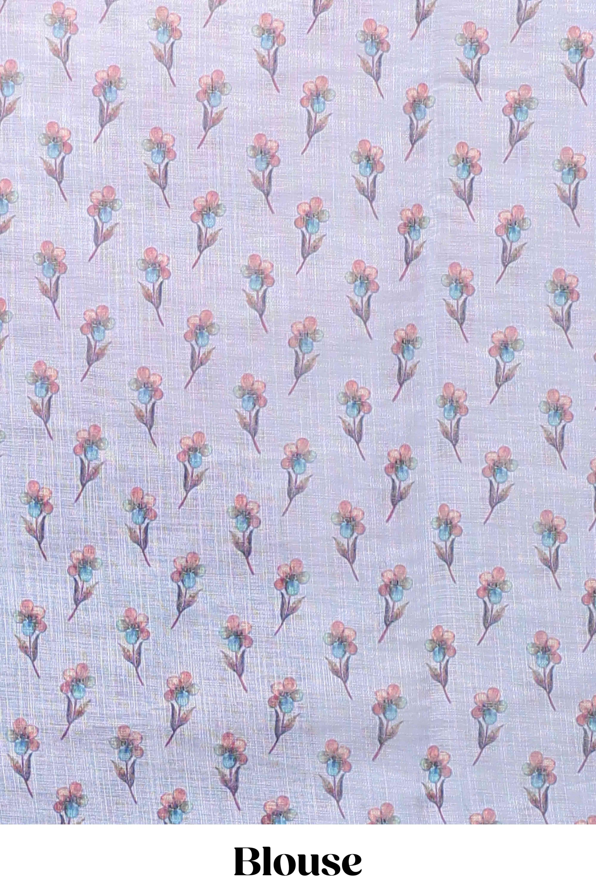 Blue floral vine design linen cotton saree with self zari border and matching printed blouse