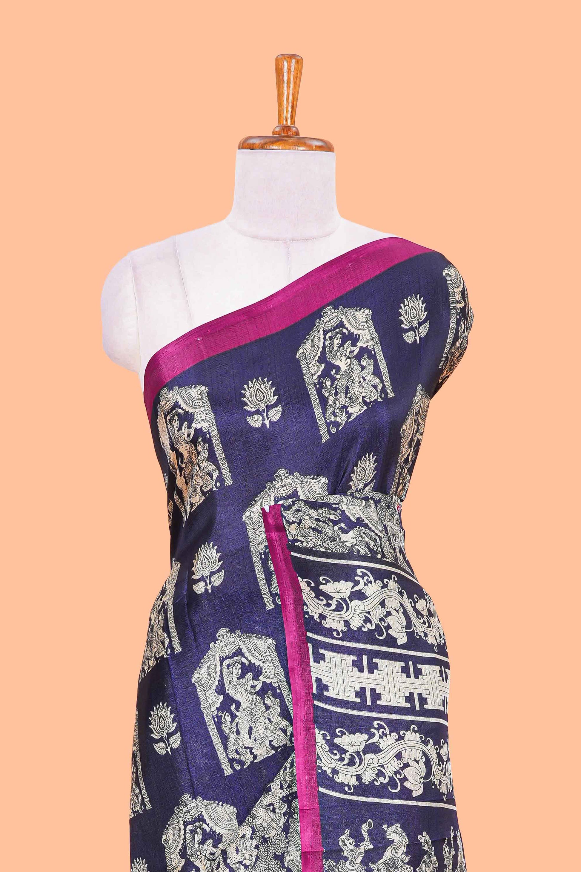 Blue south cotton saree with kalamkari print on body and pallu