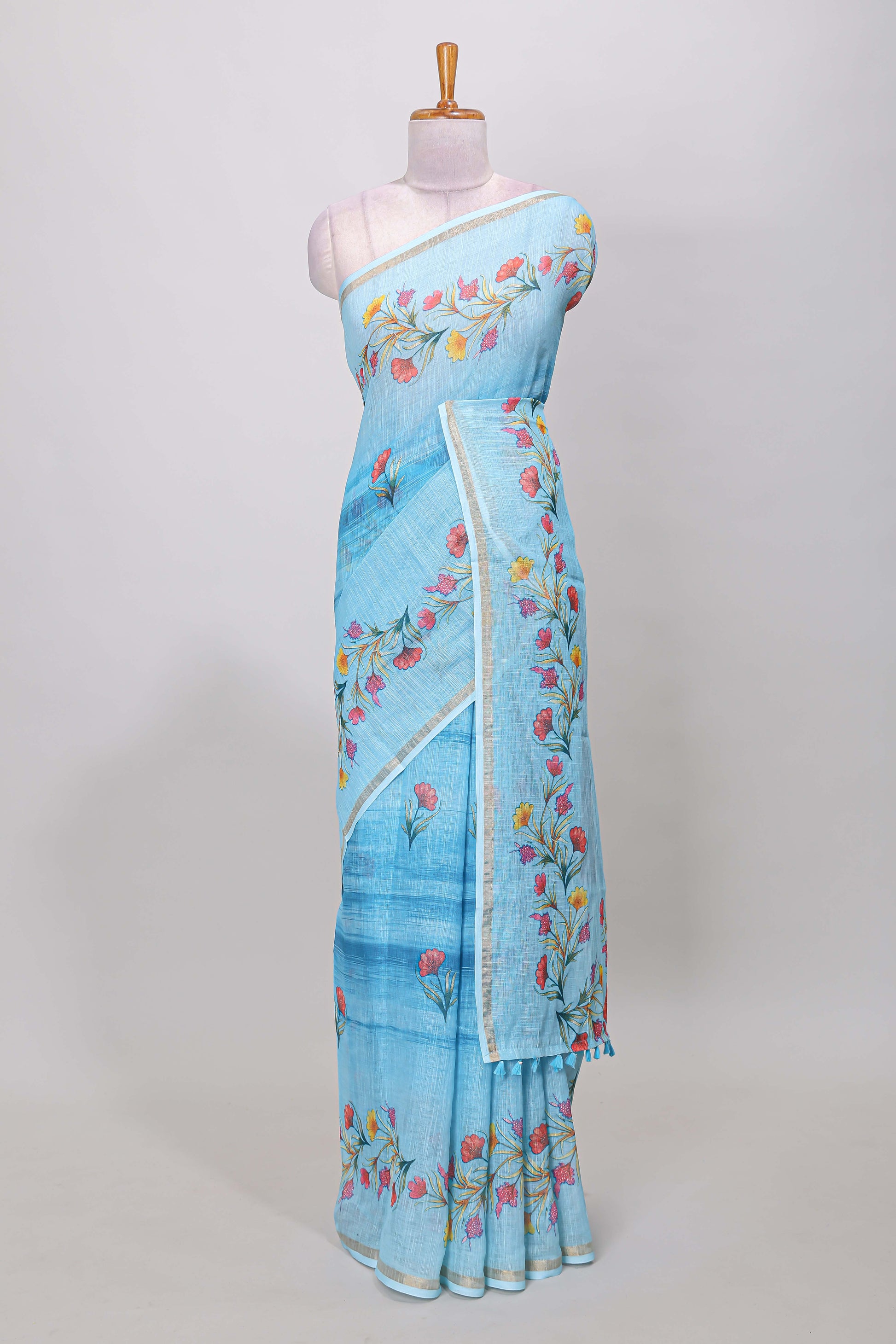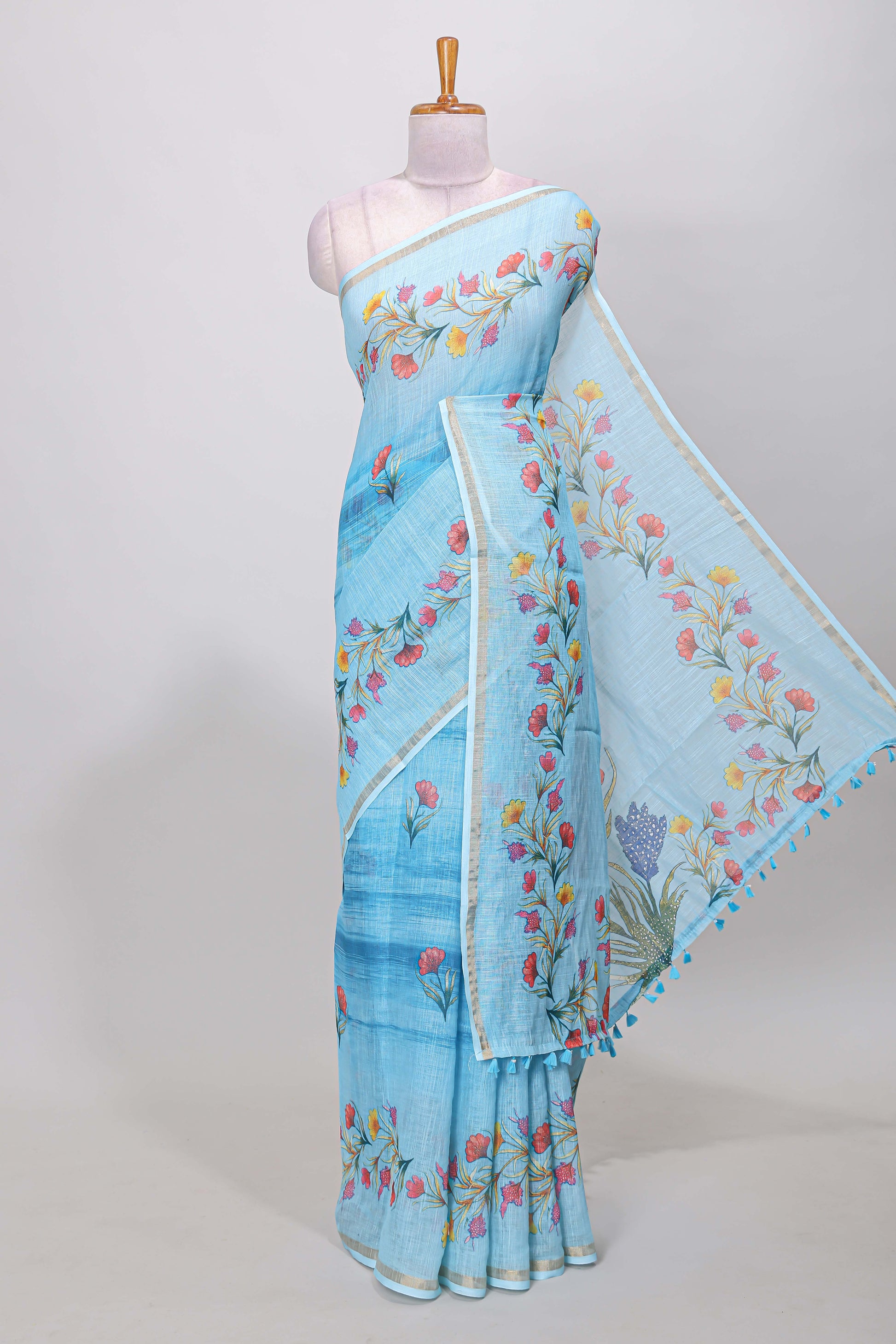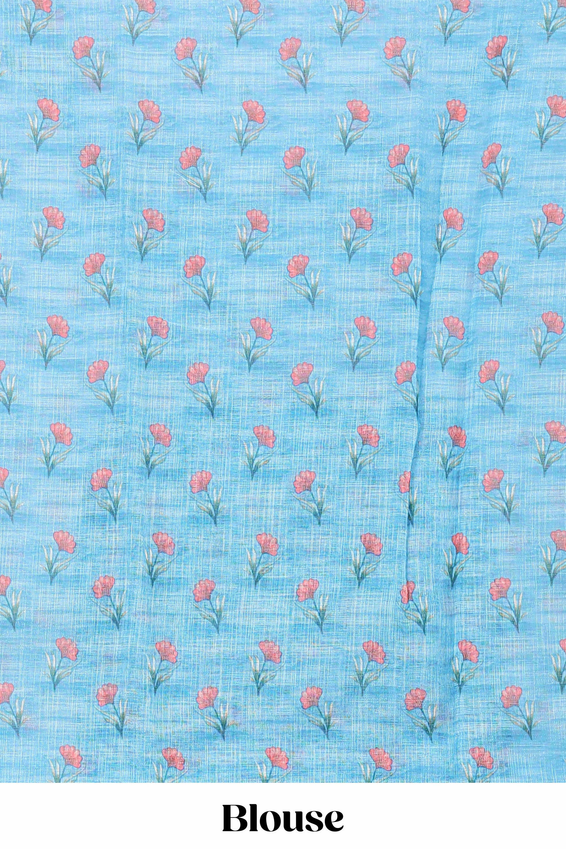 Blue linen cotton saree with floral vines print, zari border and printed blouse