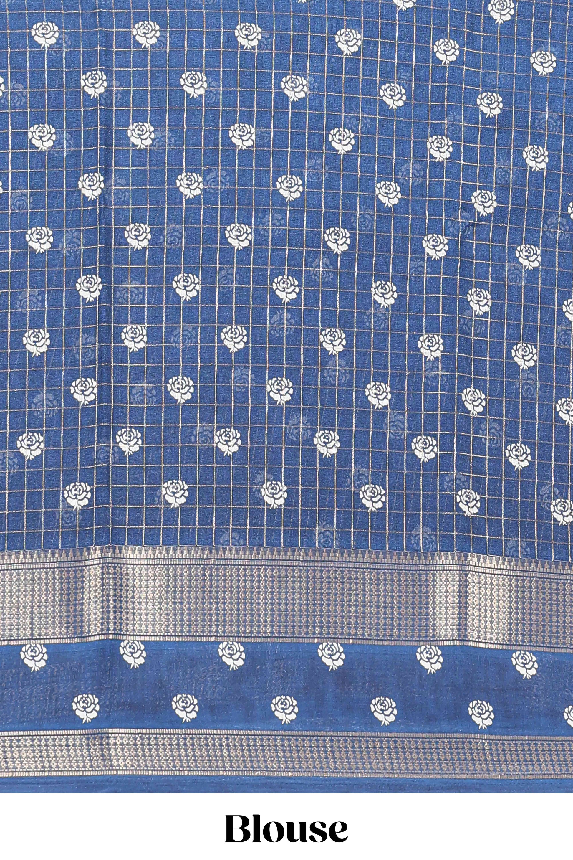 Blue marsh georgette saree with zari checks and floral printed pallu