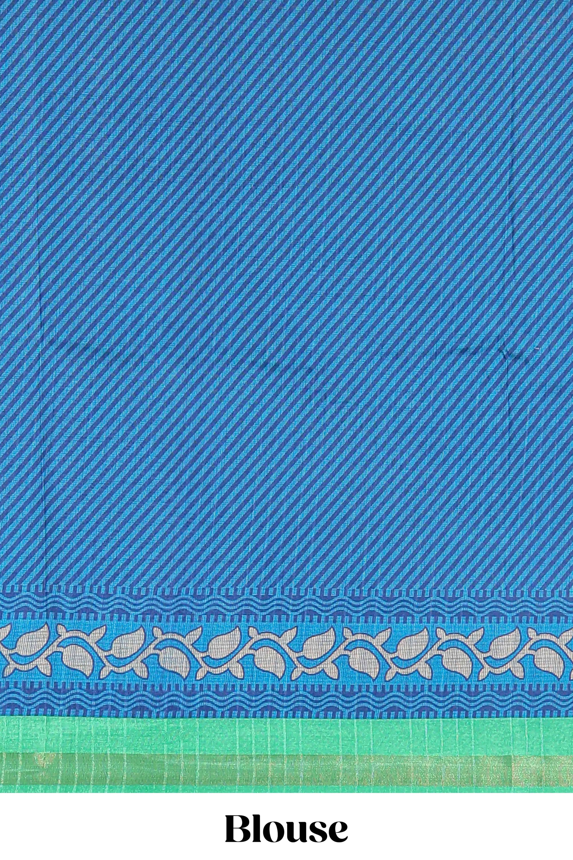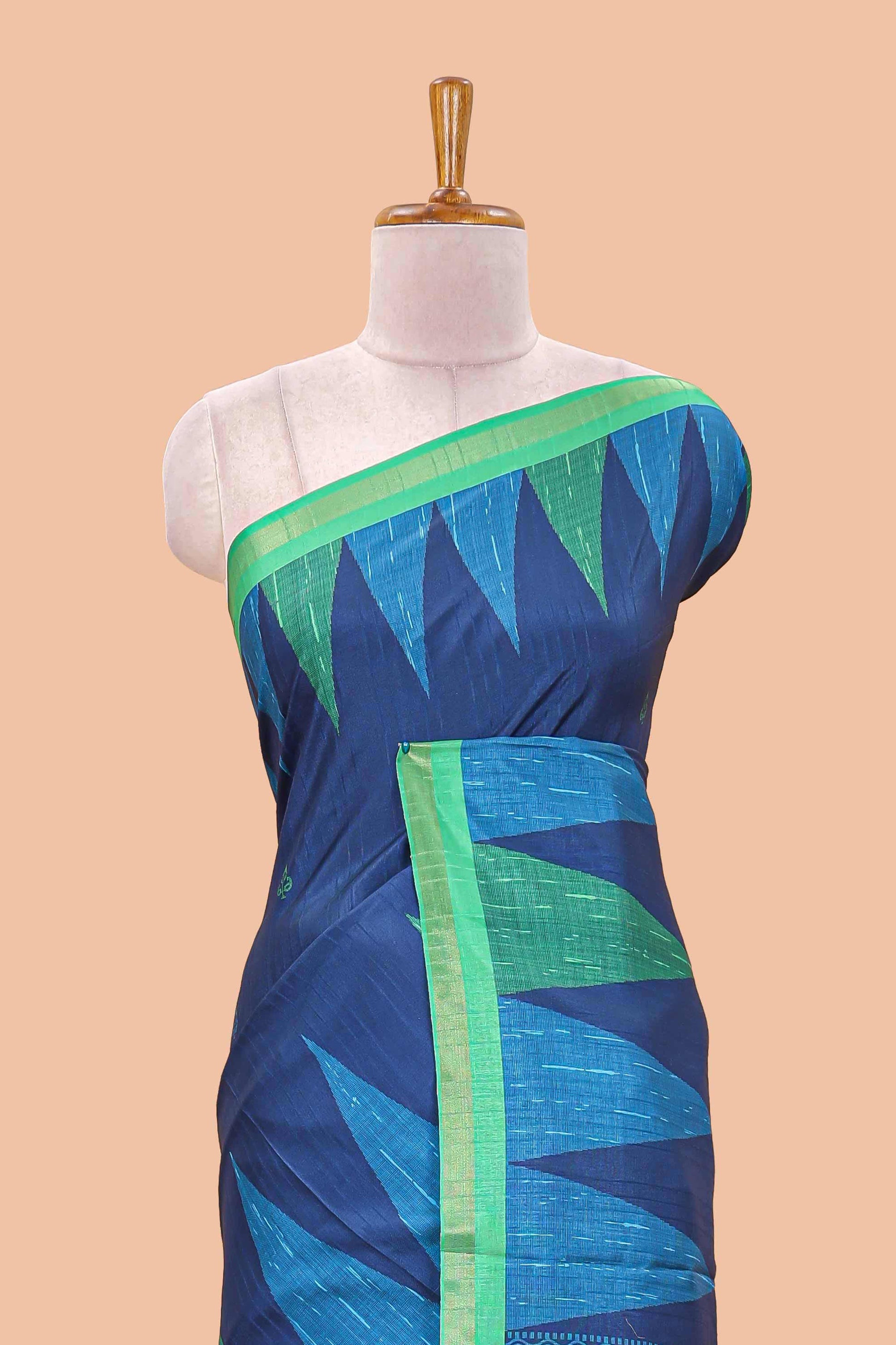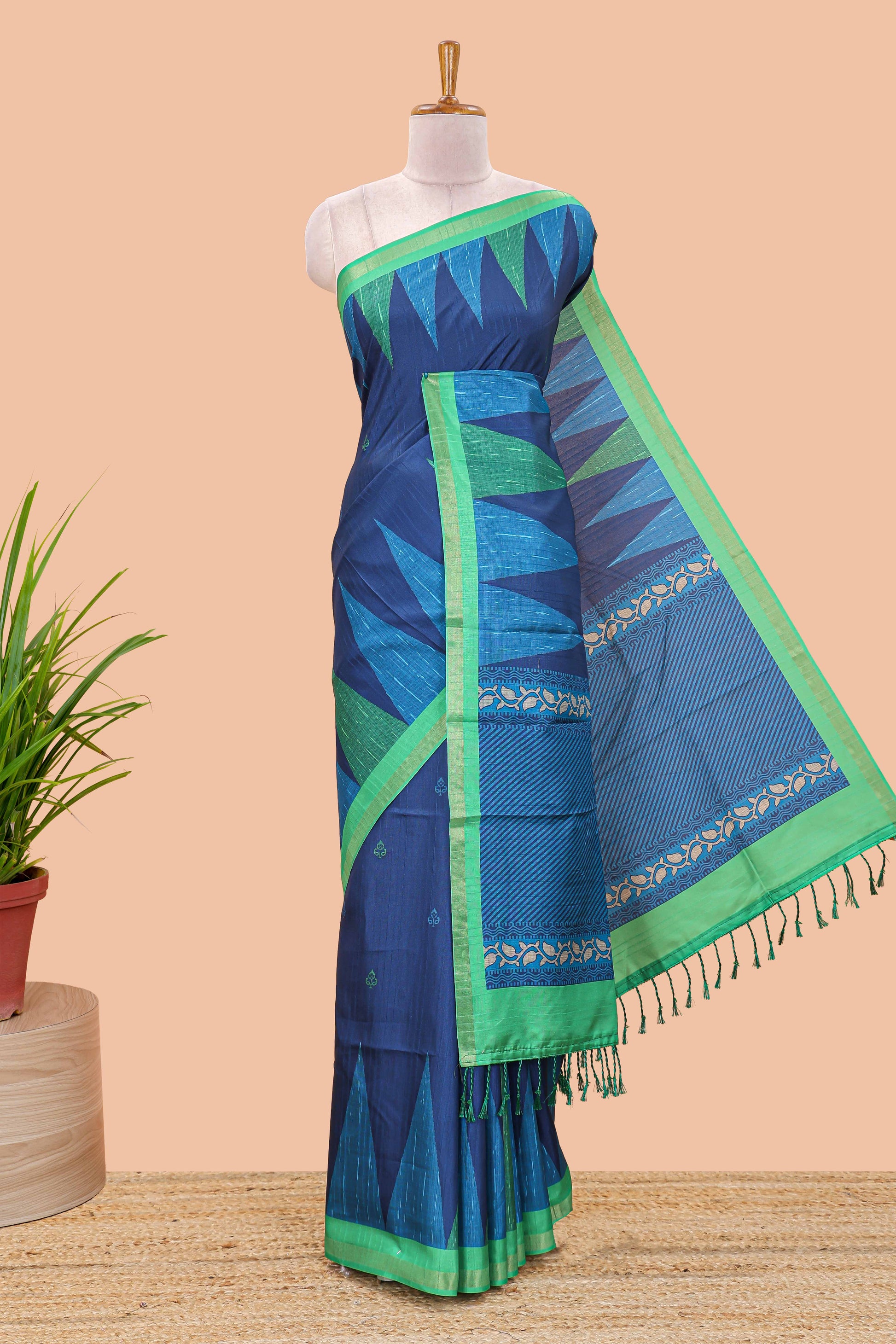 Blue semi tussar silk saree with all over paisley butta, geometric ikkat pattern and zari border