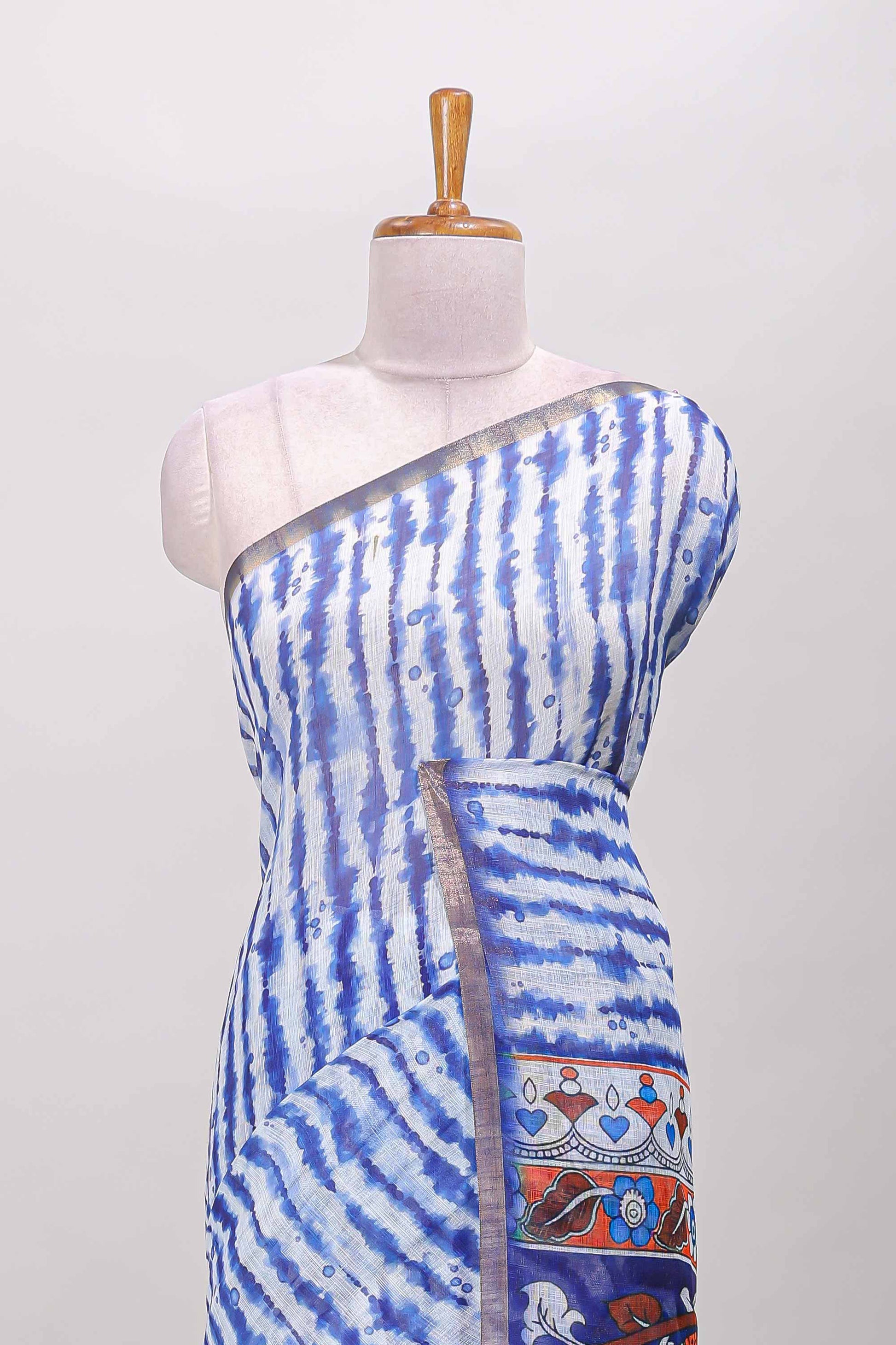Blue striped shibori print linen cotton saree with self zari border and printed pallu