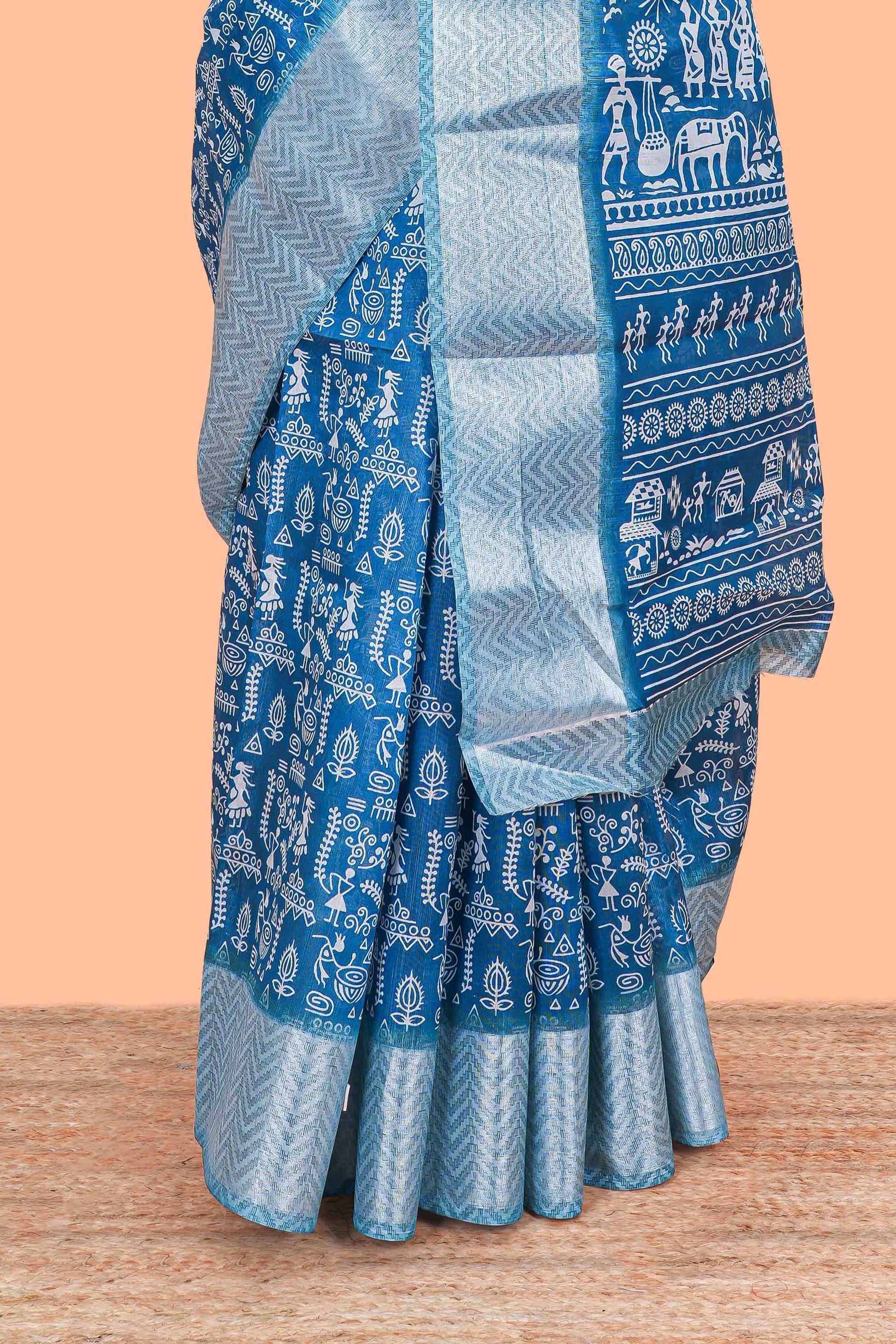 Blue warli print south cotton saree with contrast zari border and blouse