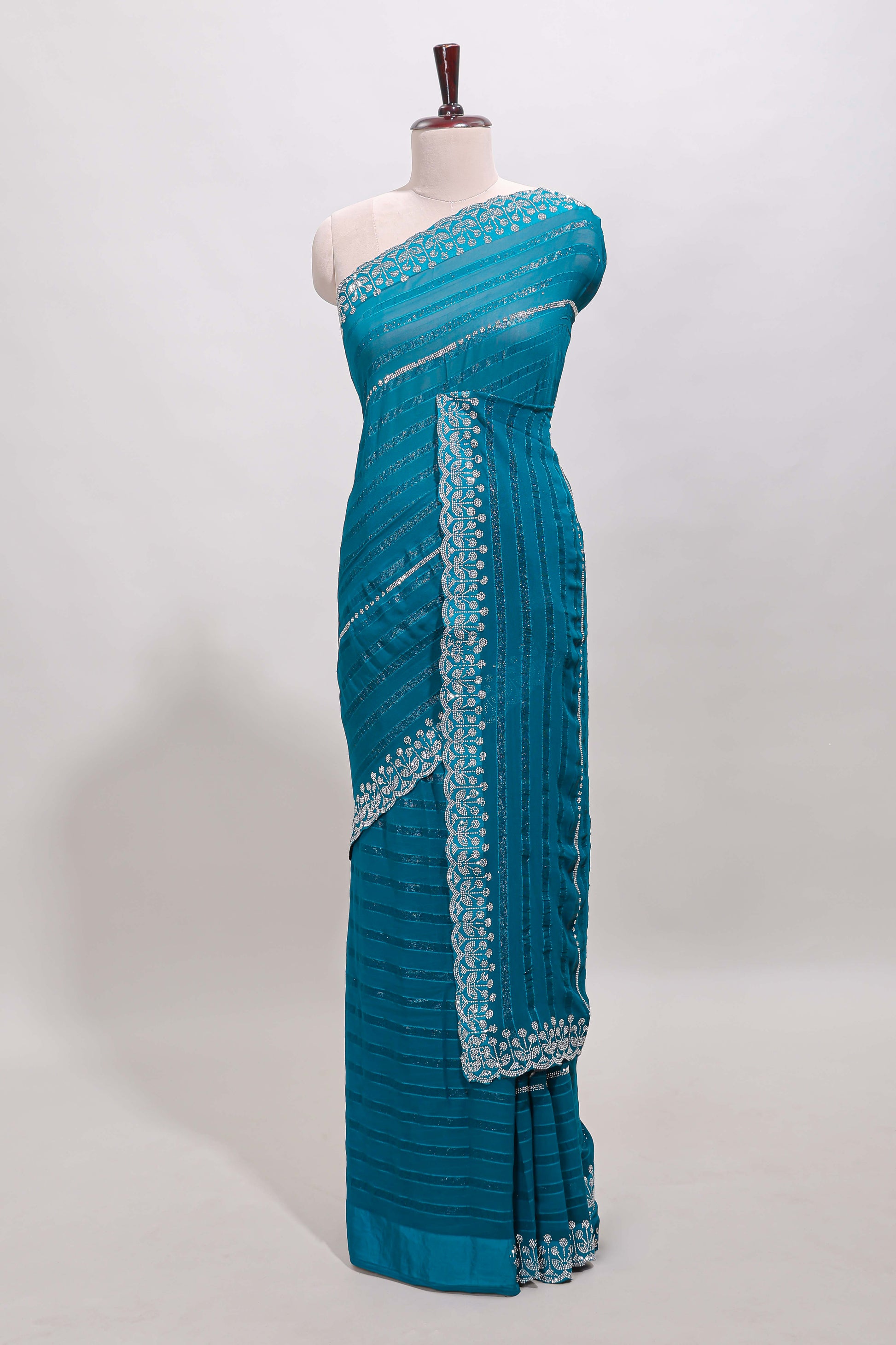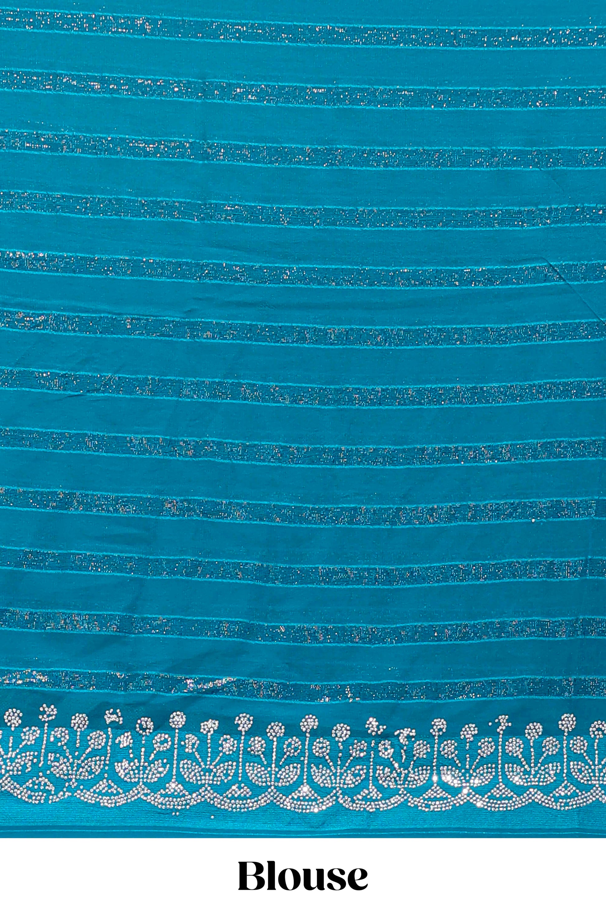 Bondi blue striped design stone work designer saree with self scallop border and matching blouse