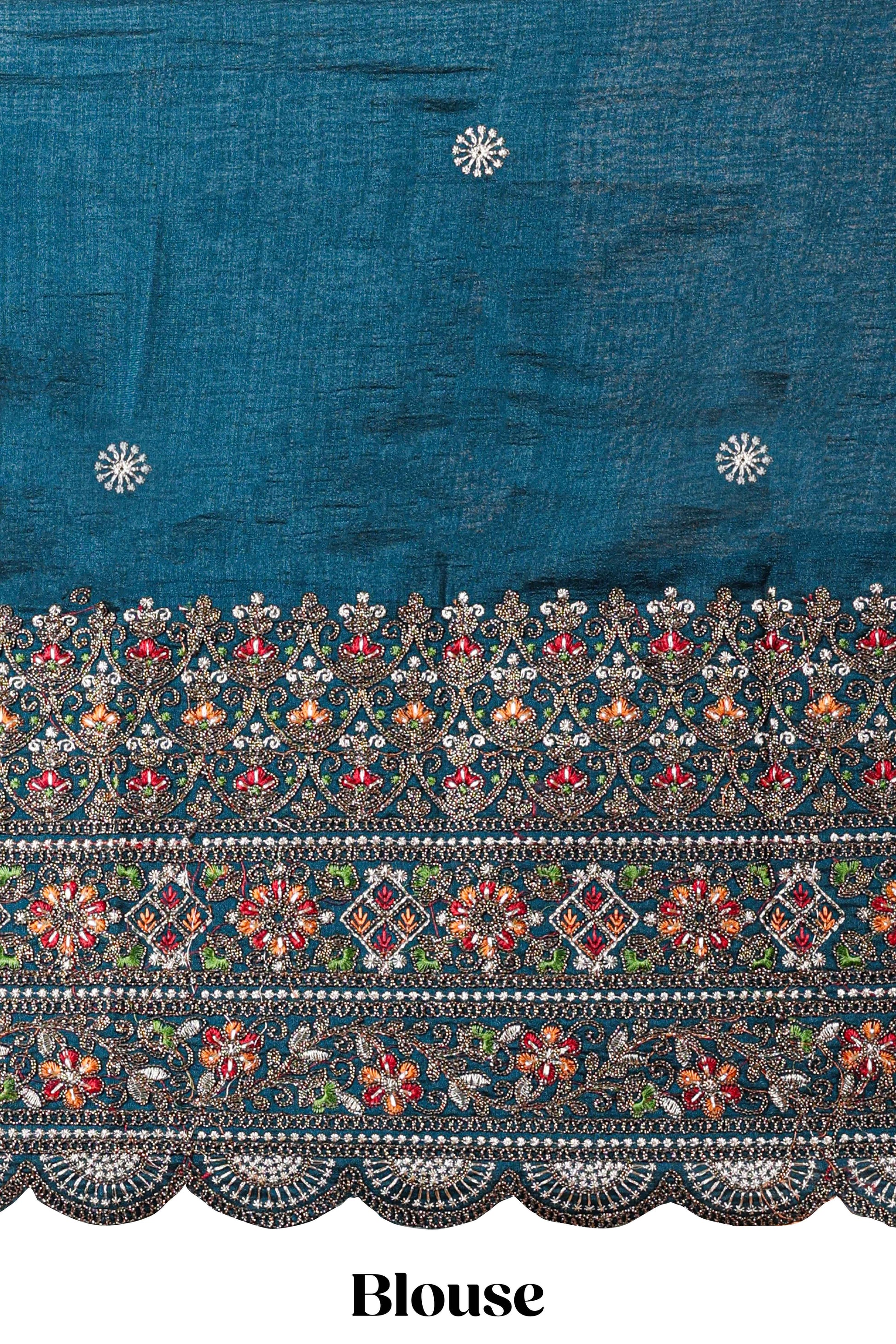 Borderless blue crush texture satin crepe saree with contrast embroidery blouse
