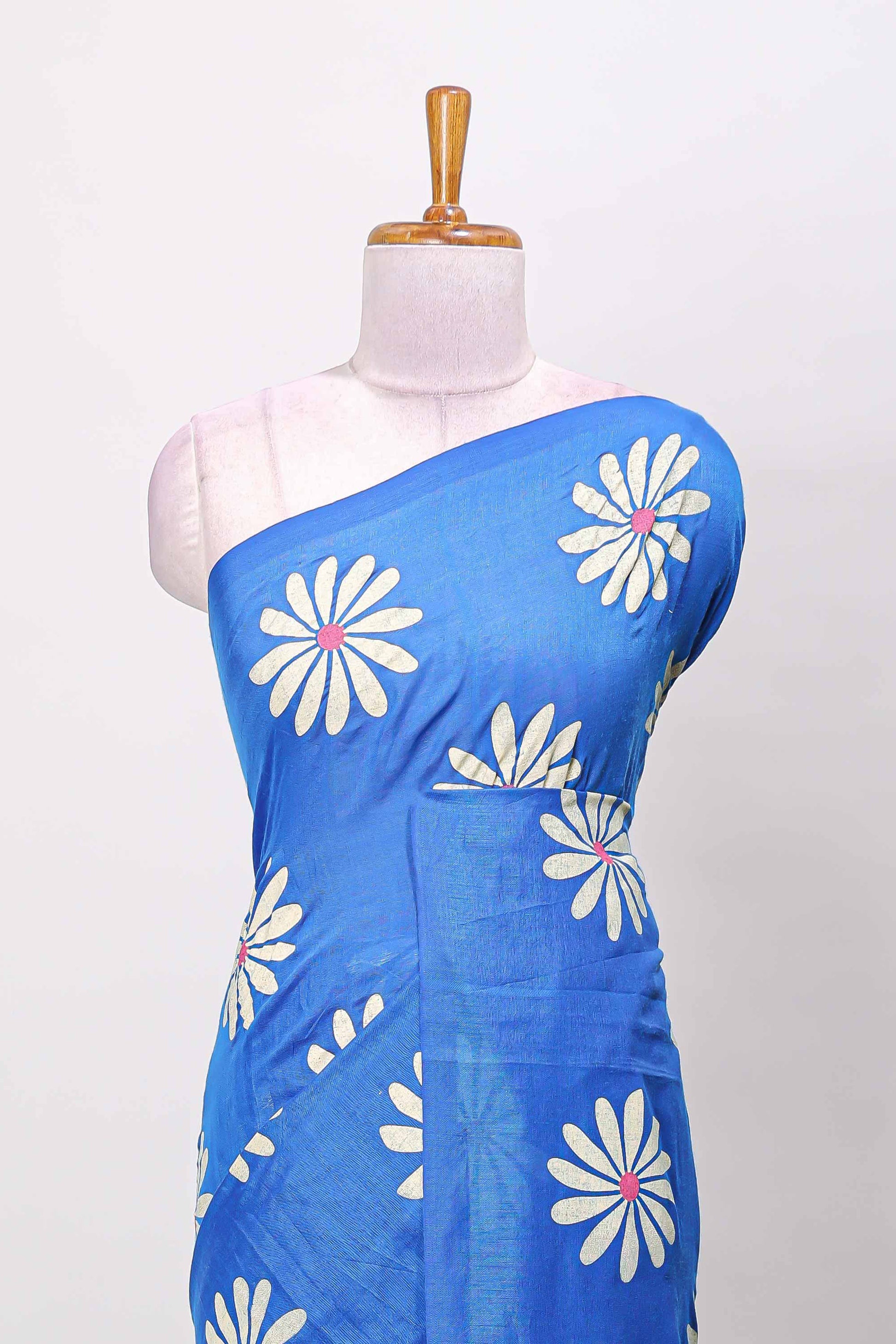 Borderless blue floral print south cotton saree with contrast printed blouse