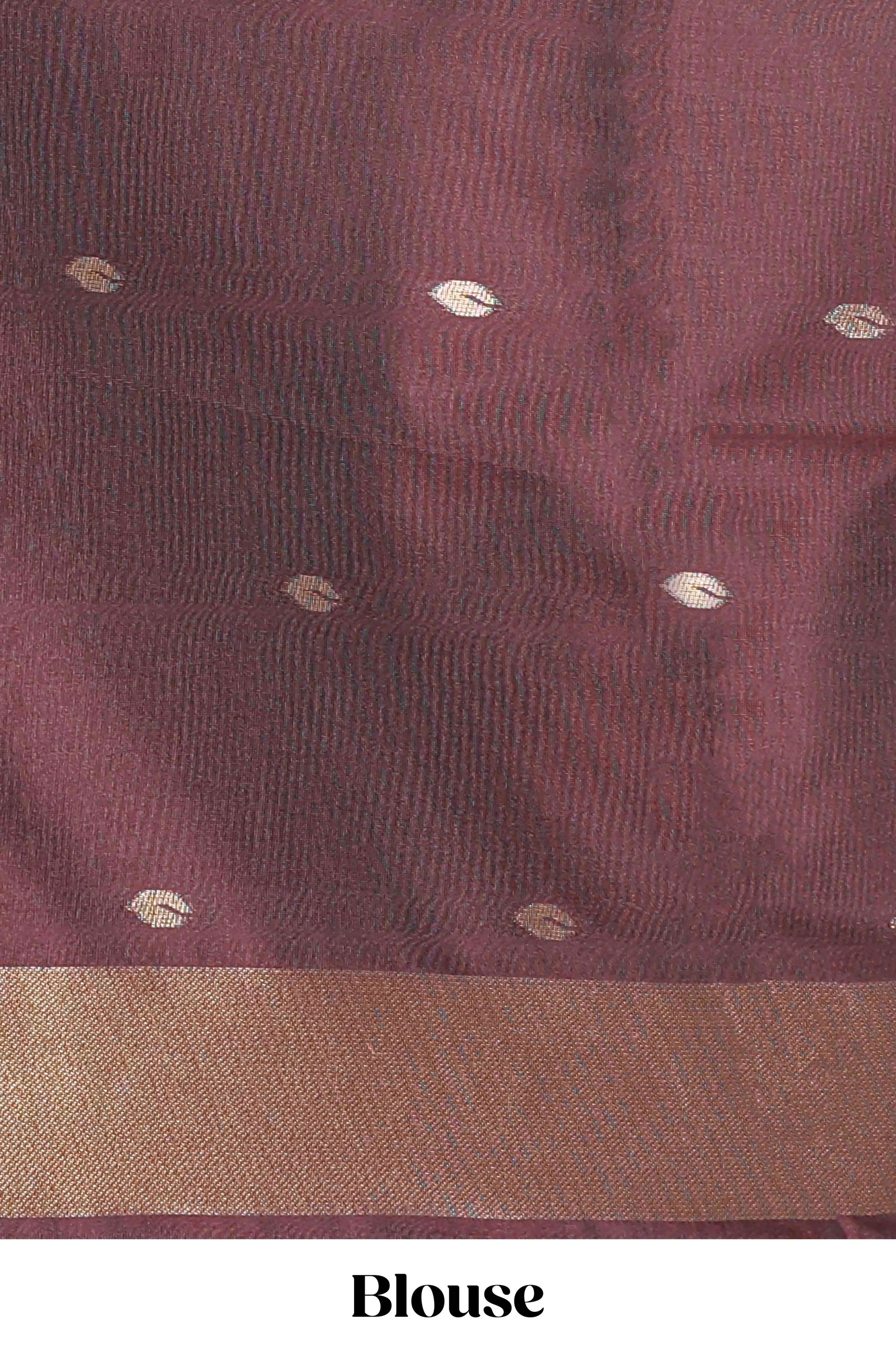 Borderless brown leaf zari butta and birds design semi soft silk saree with self pallu and matching blouse