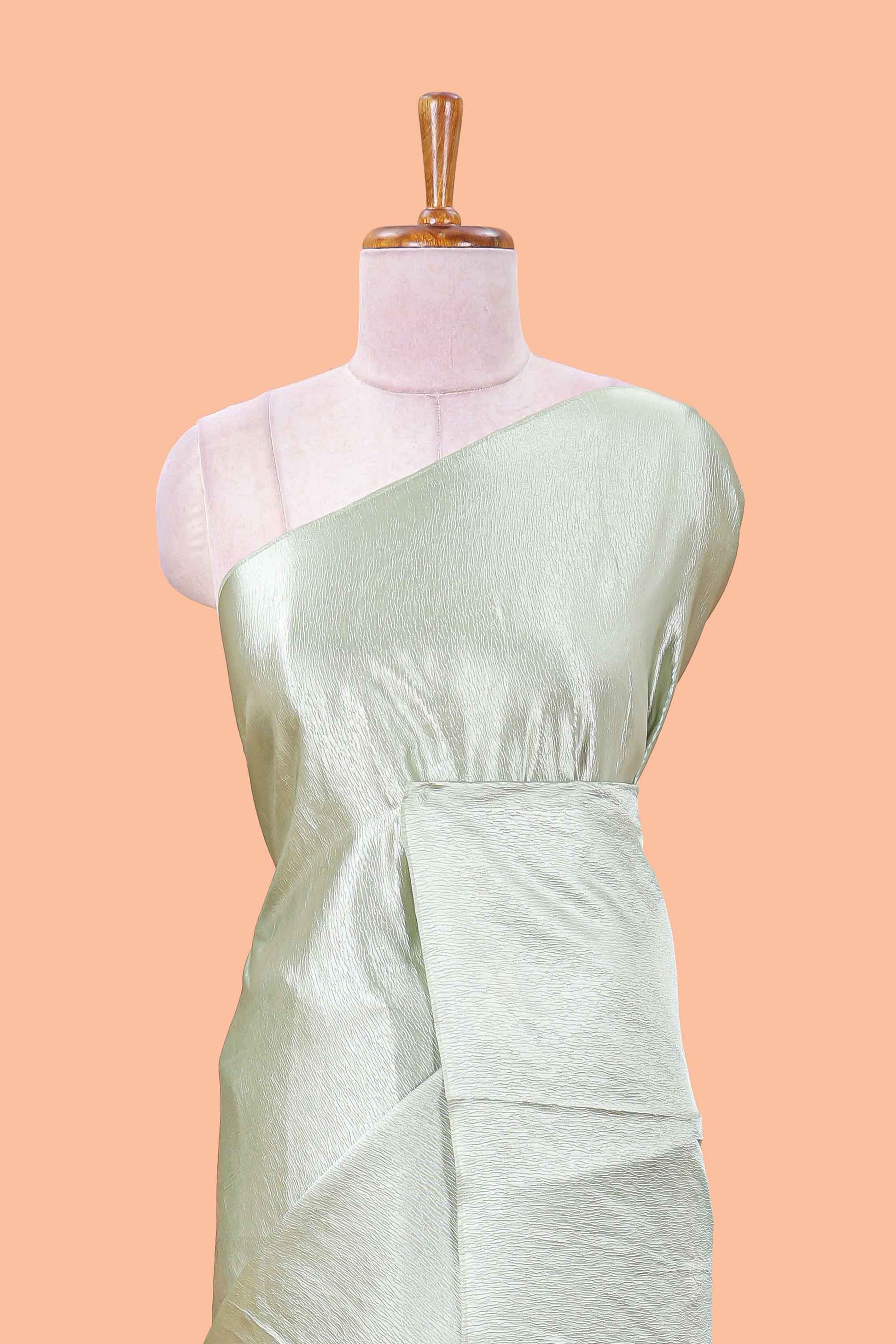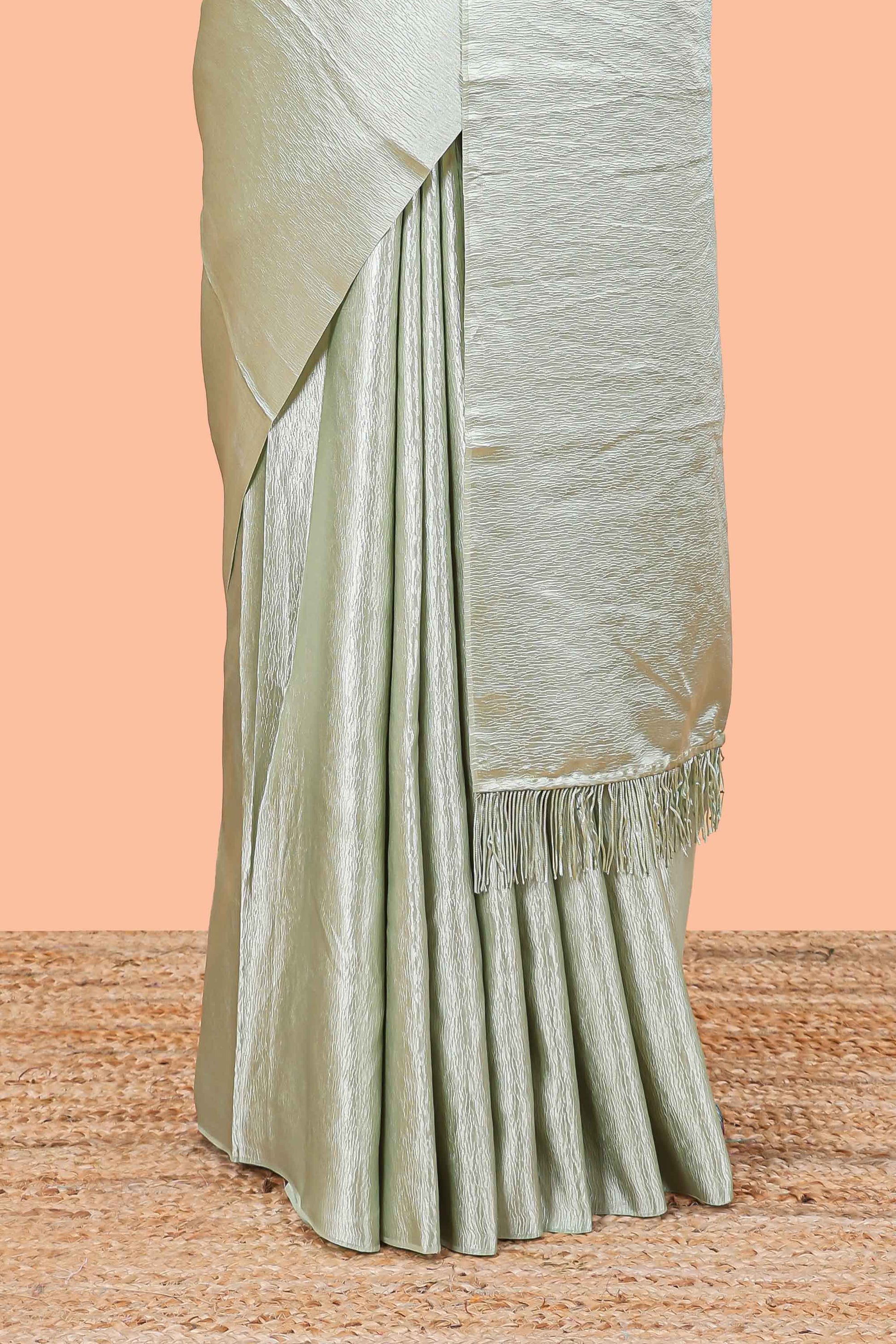 Borderless green crush texture satin crepe saree with contrast embroidery blouse