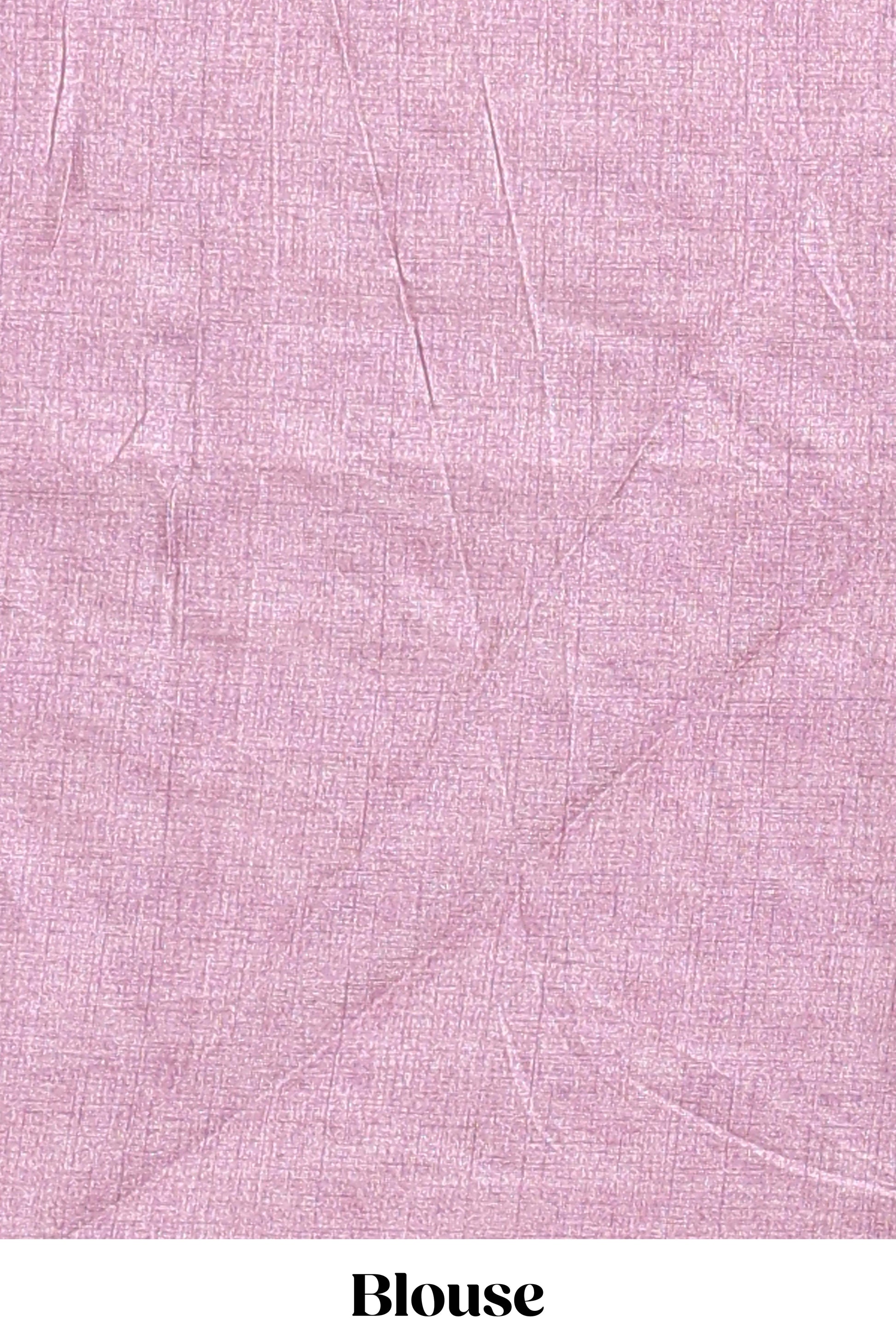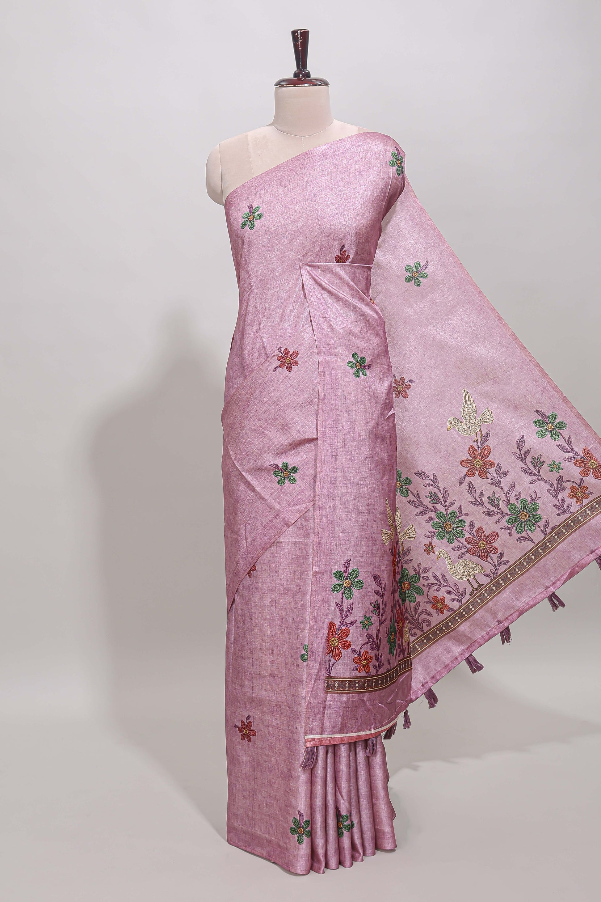 Borderless pink floral motifs art tussar saree with matching blouse and floral design pallu