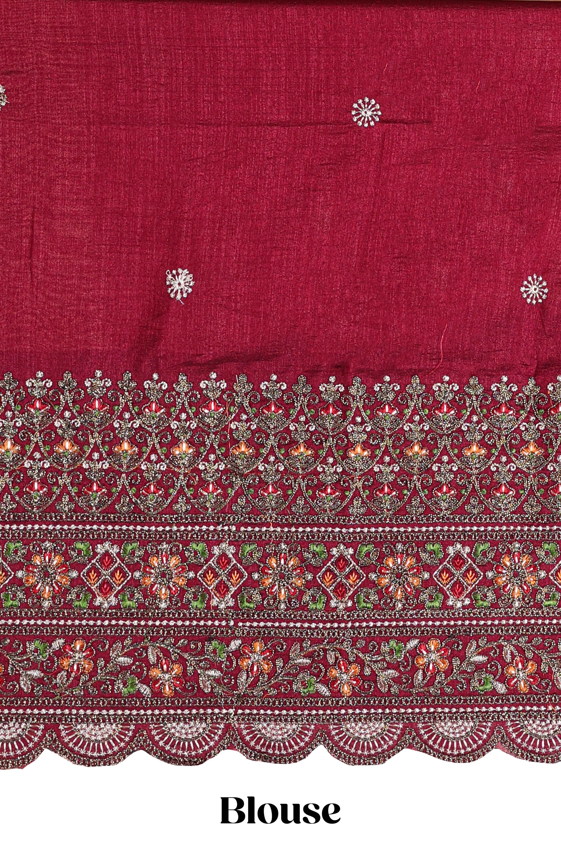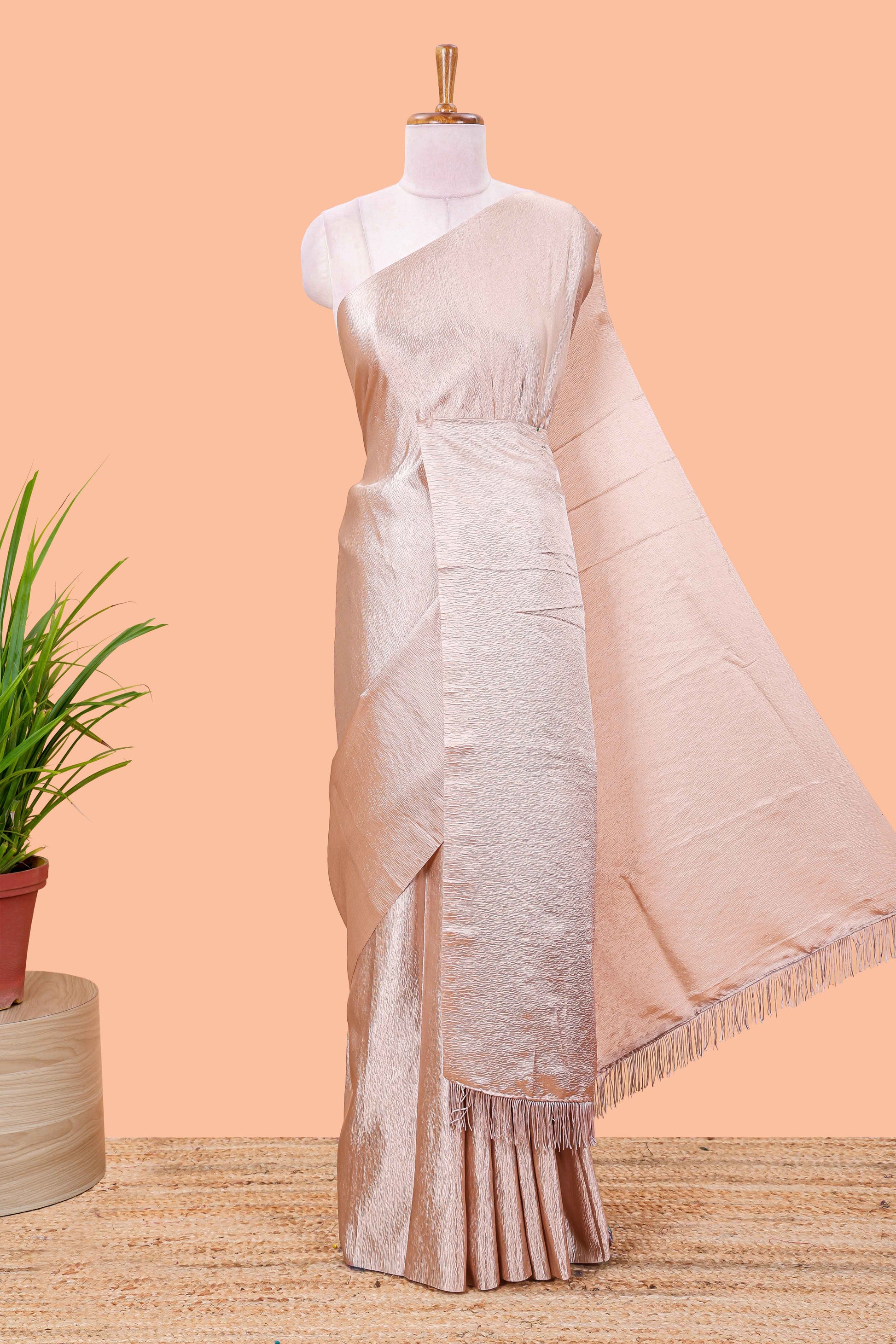 Borderless sandal crush texture satin crepe saree with contrast embroidery blouse