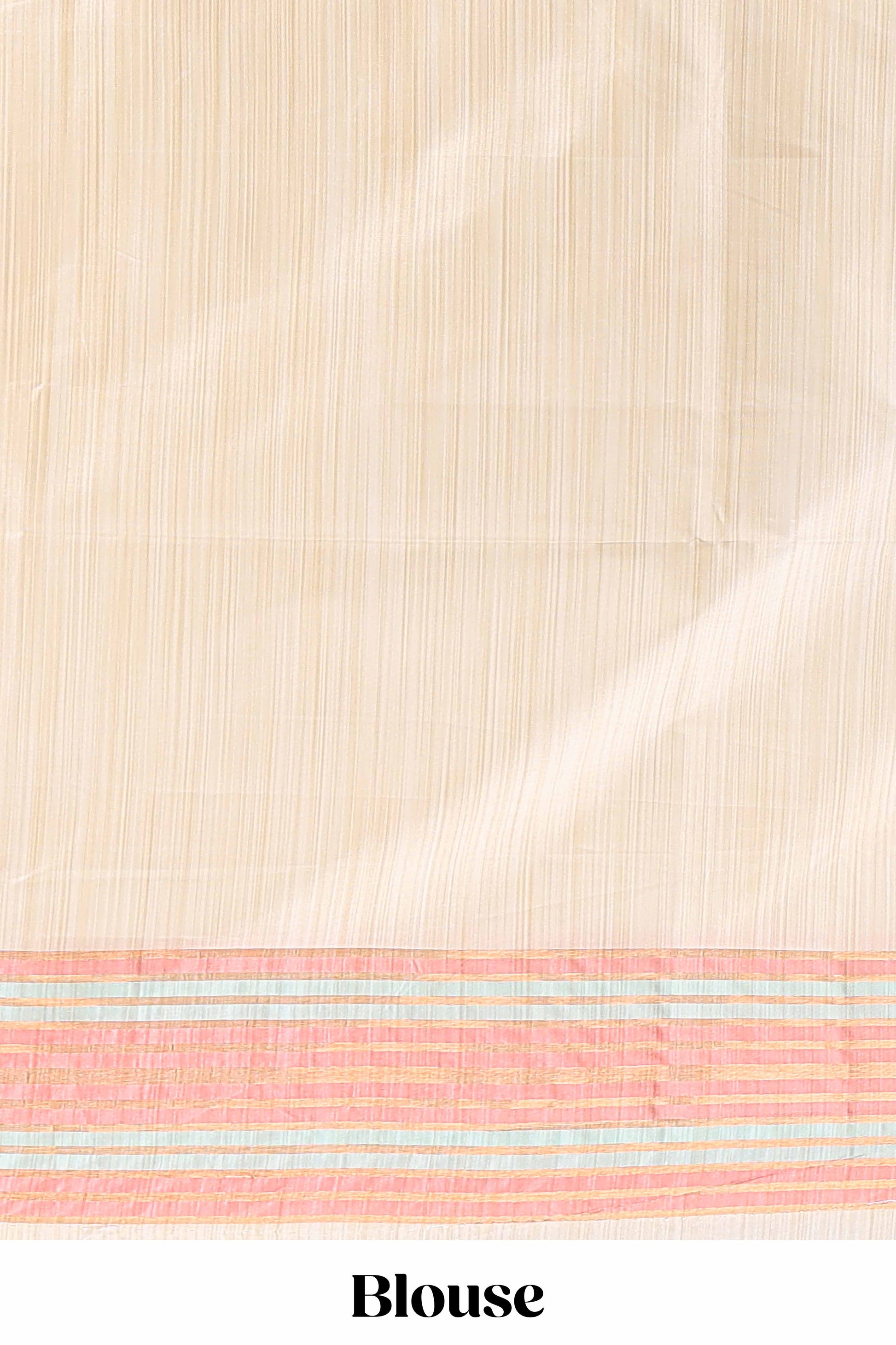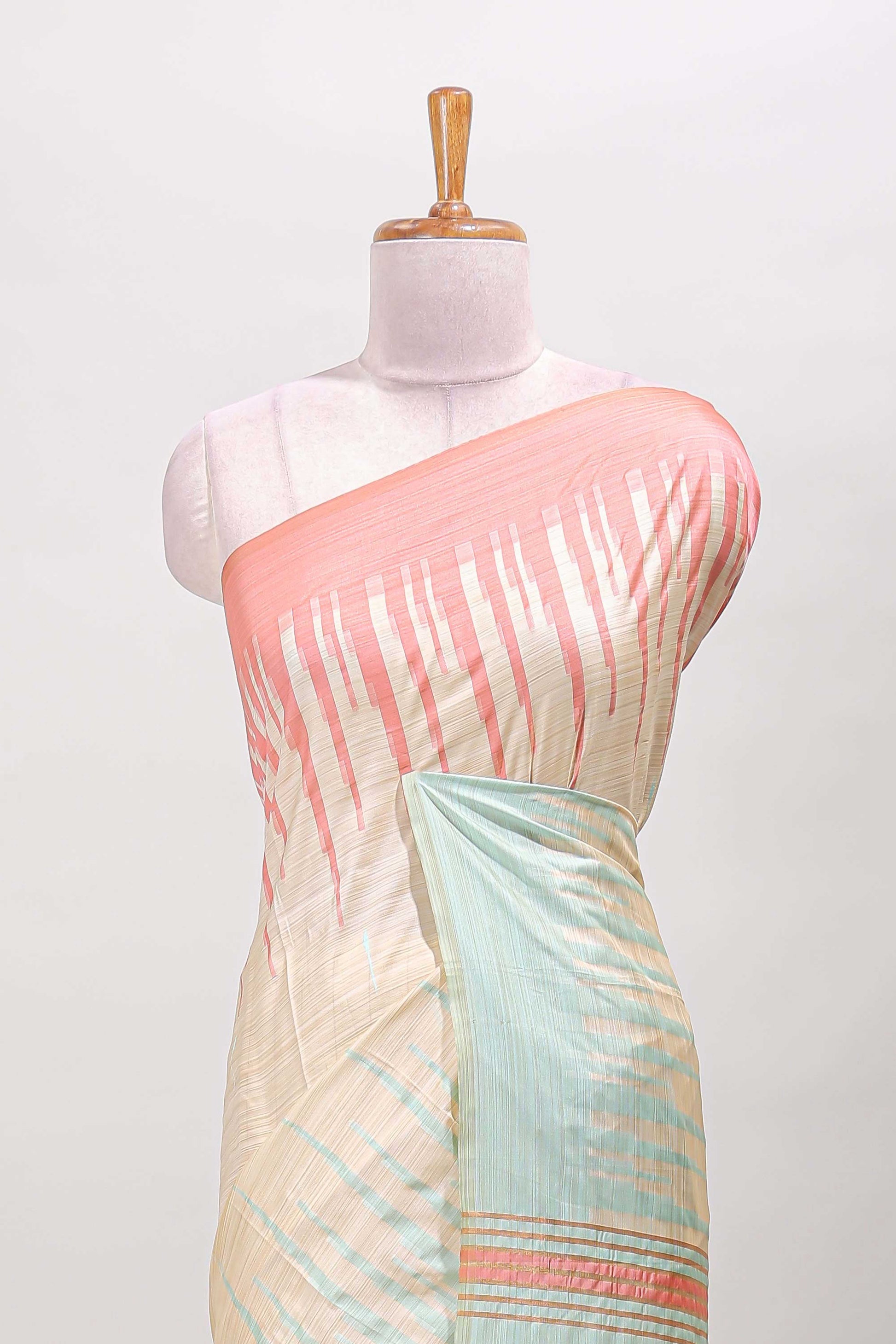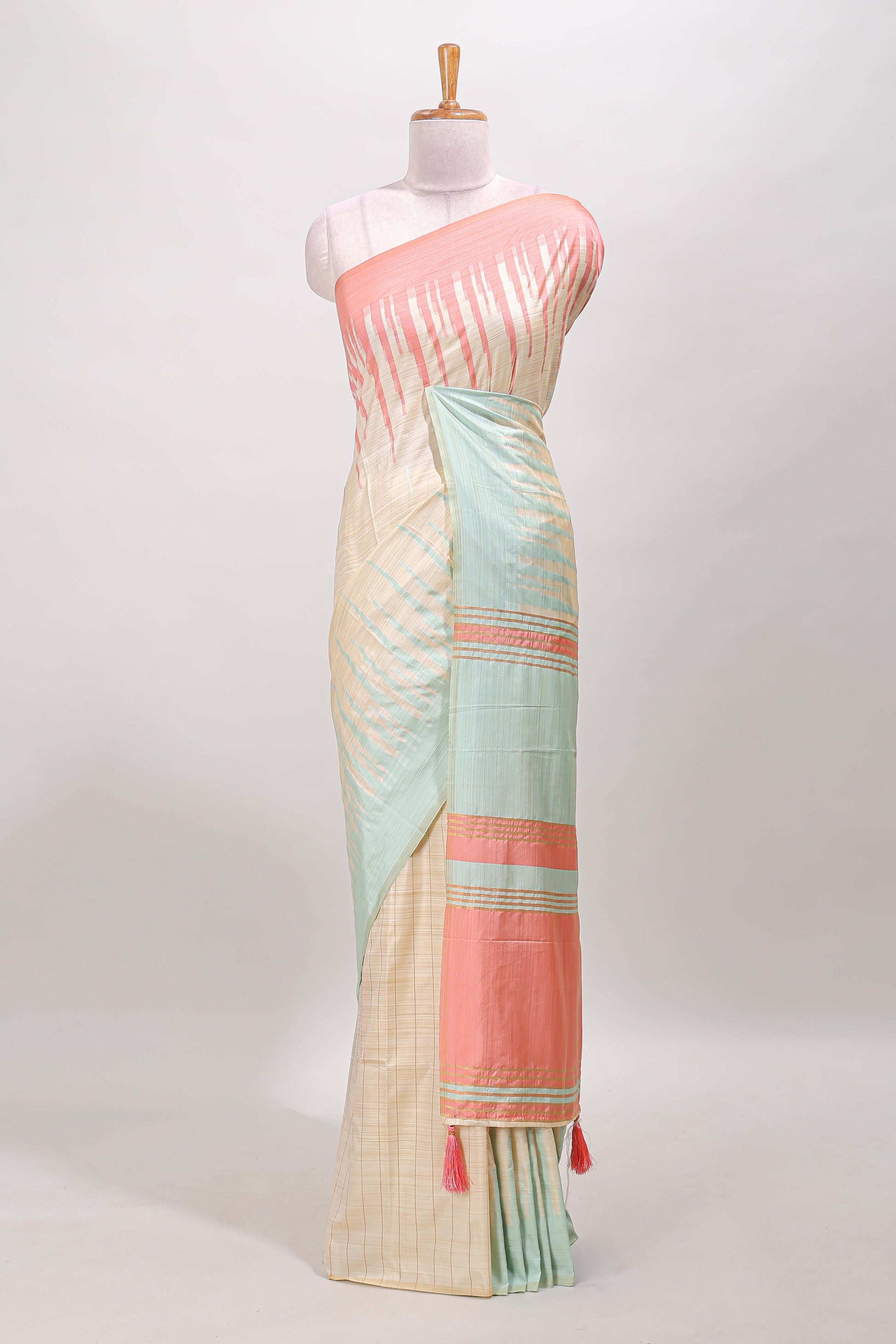 Borderless sandal striped peach & ice blue shade ikkat style semi soft silk saree with contrast striped pallu and matching blouse
