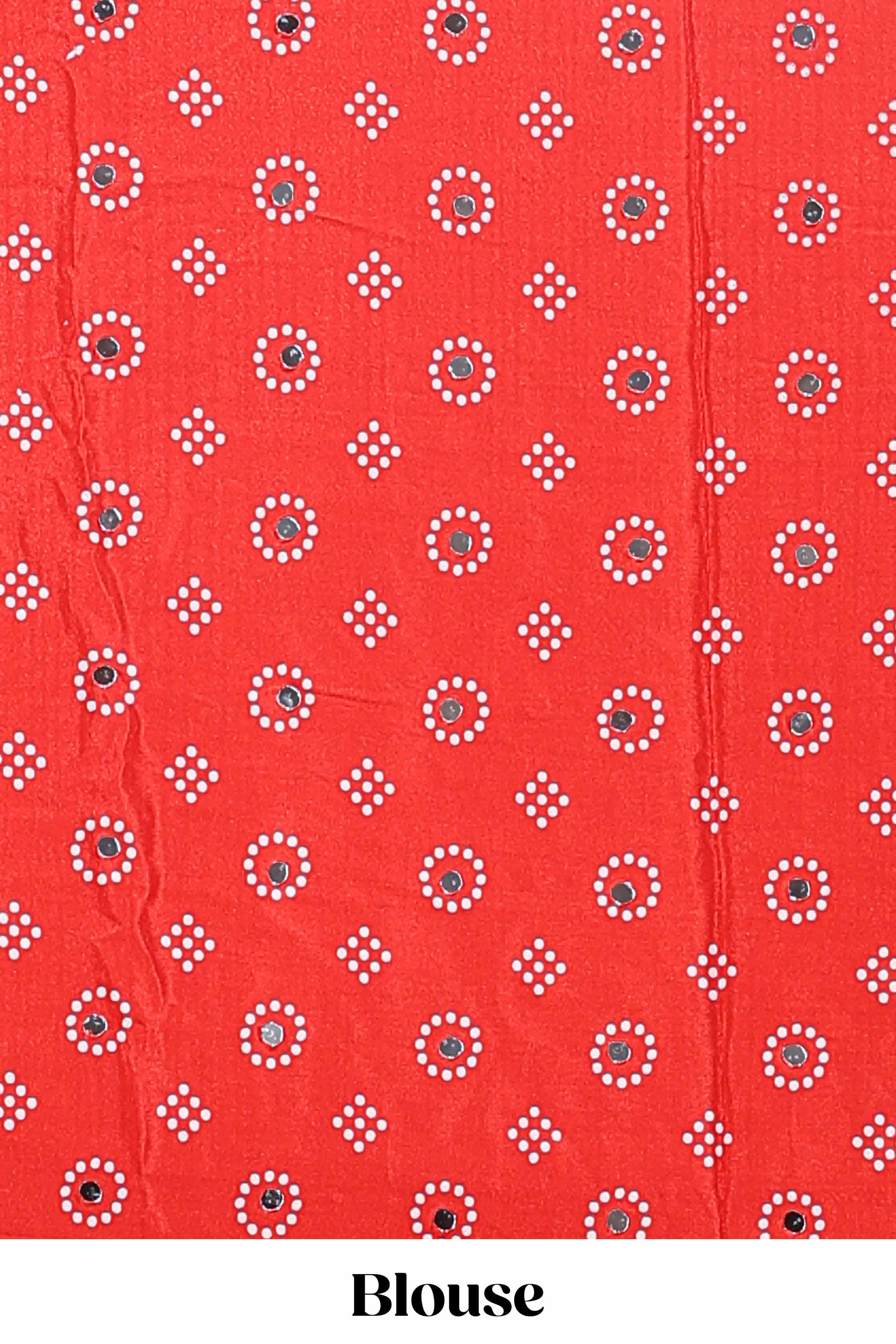 Borderless white bandhani style mirror work masakali saree with multicolor design and contrast blouse
