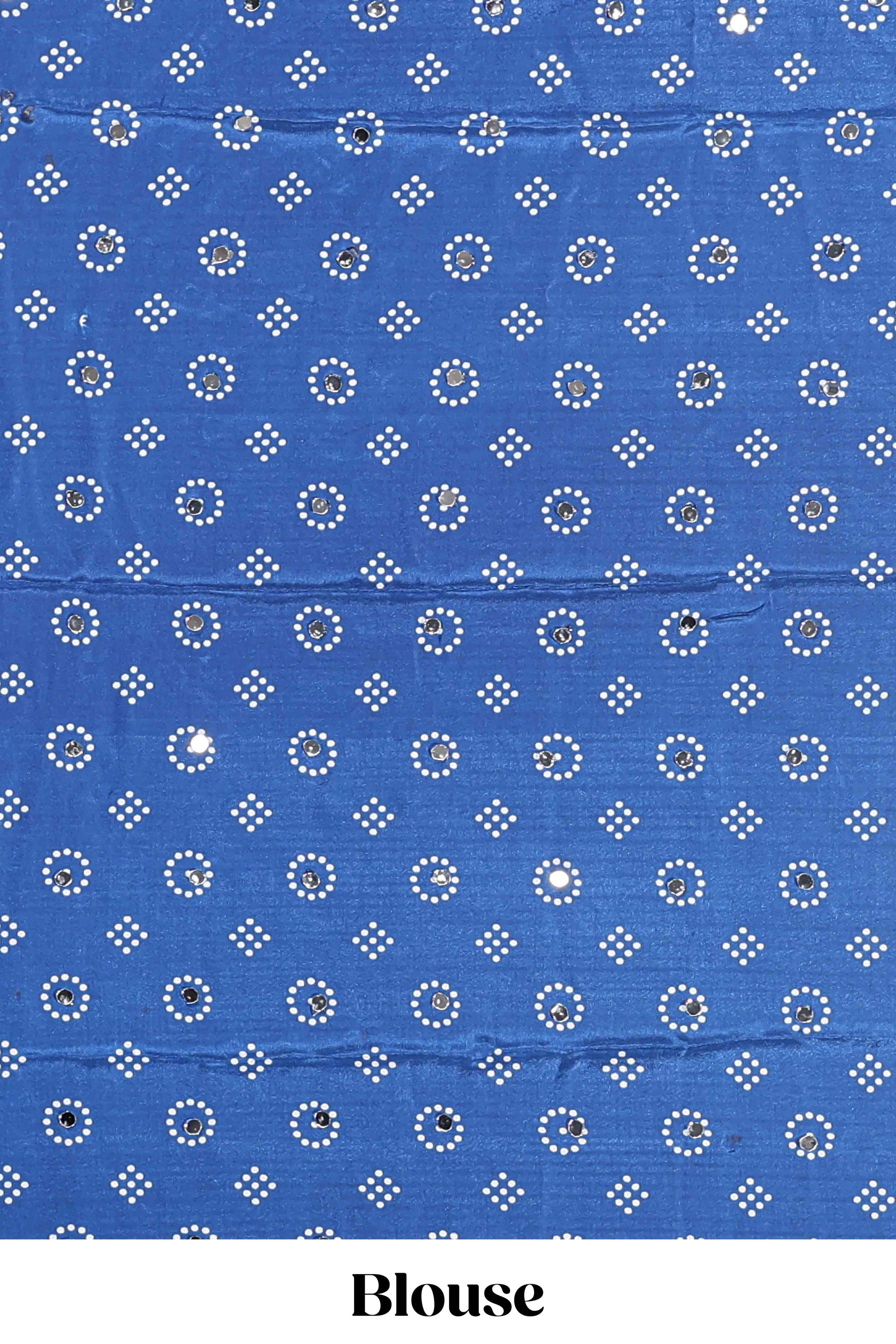 Borderless white bandhani style mirror work masakali saree with multicolor design and contrast blouse